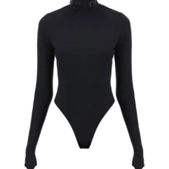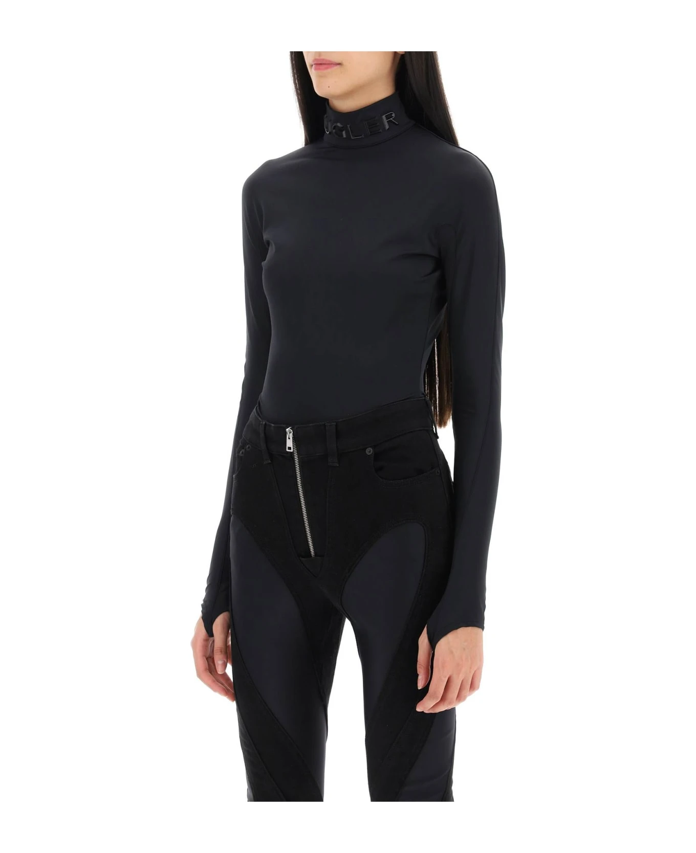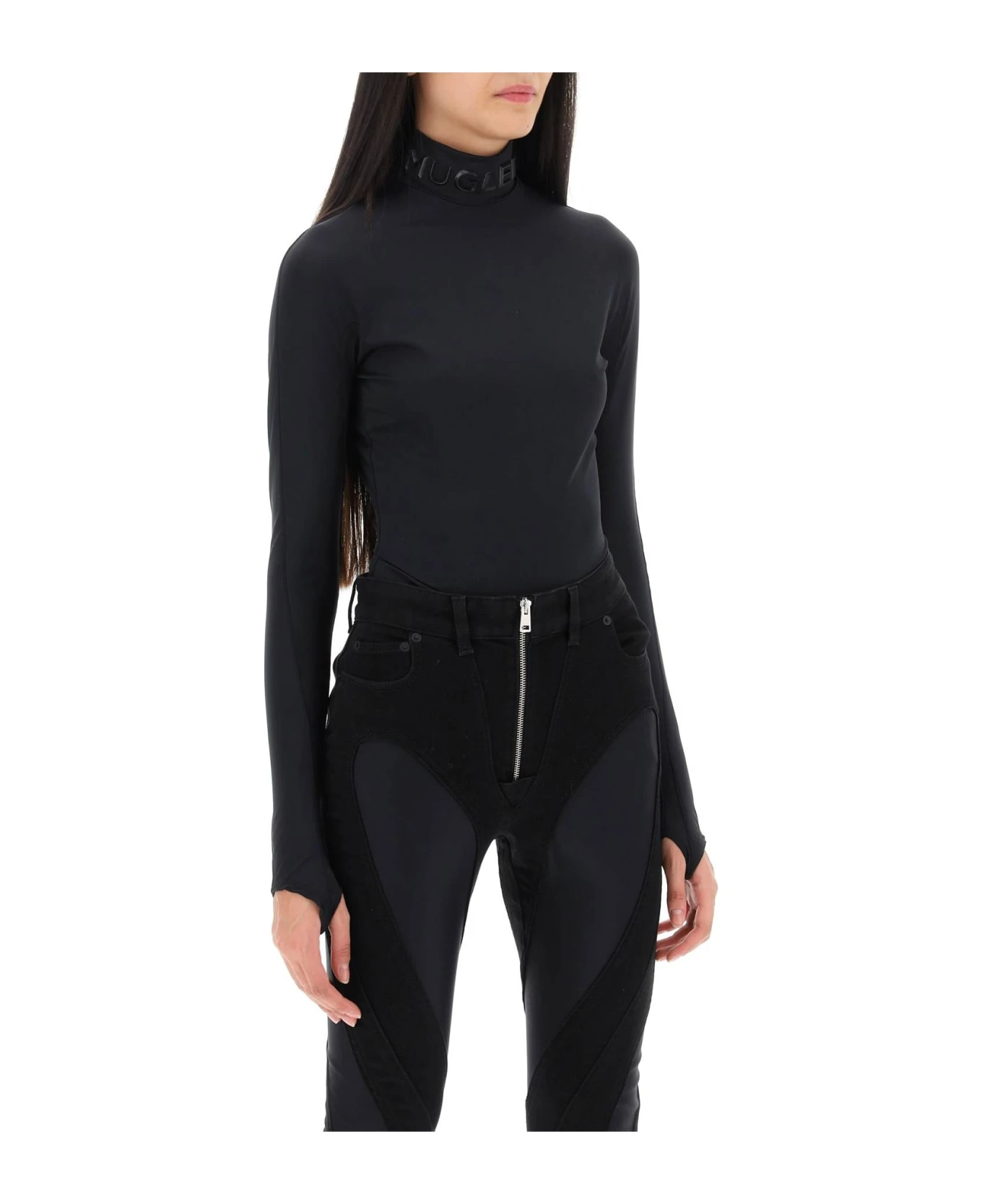 Second-skin effect bodysuit by Mugler crafted in Lycra with stand collar branded with embossed logo lettering. It features long sleeves with thumbhole cuffs, back invisible zipper closure with logoed puller, snap buttons at the crotch. The model is 177 cm tall and wears size FR 36.