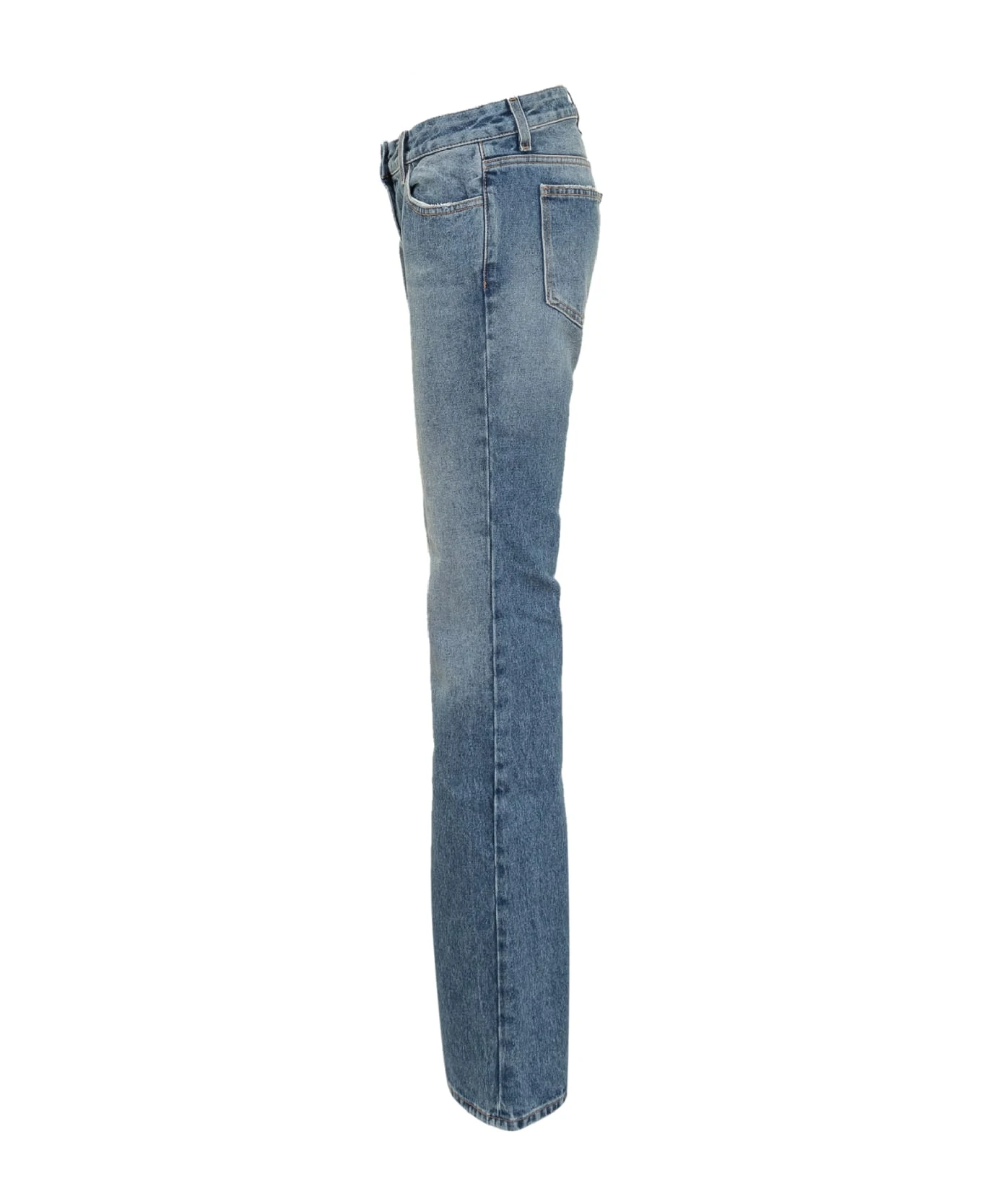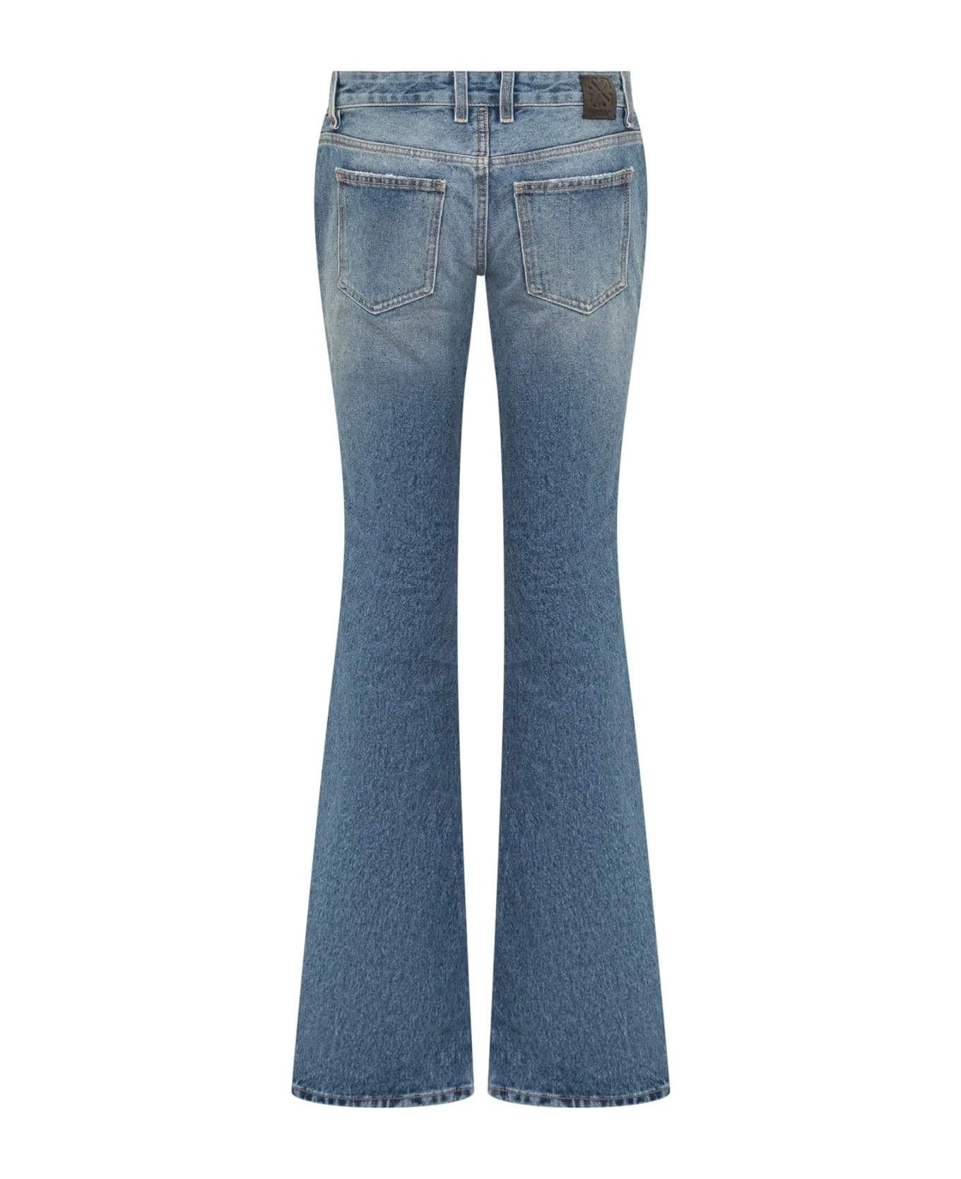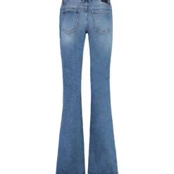 Long flared jeans. Slim fit. Button and zip closure. Belt loops. Five pockets. Logo patch on the back.