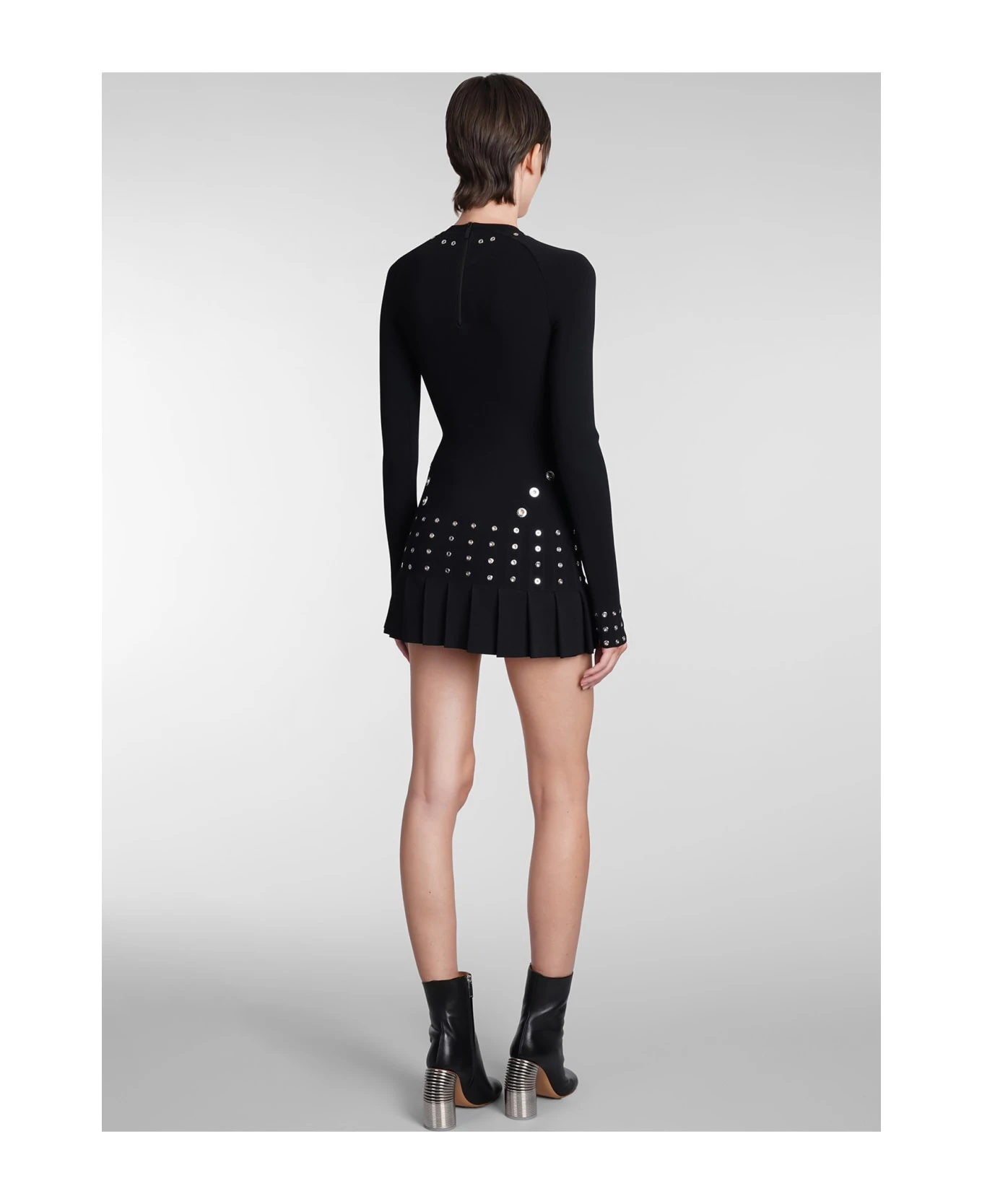 Dress in black viscose, round neck, long sleeves, studs detail, silver hardware, zip clousure, 64% Viscose 33% Nylon 3% Elastane, 21% polyamide, 13% polyester, 52% polyurethane, Made in Italy, model is 180 cm and wears size 40
