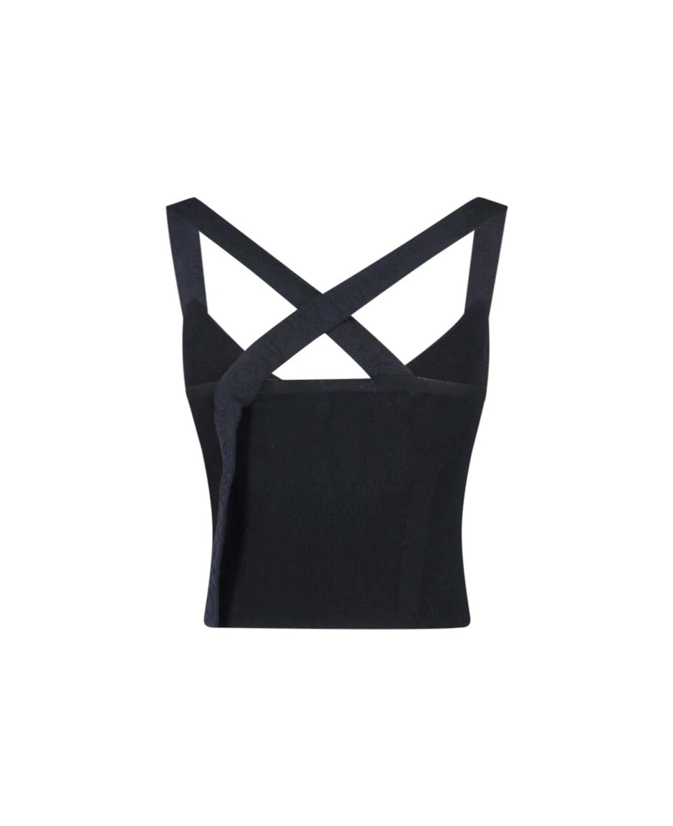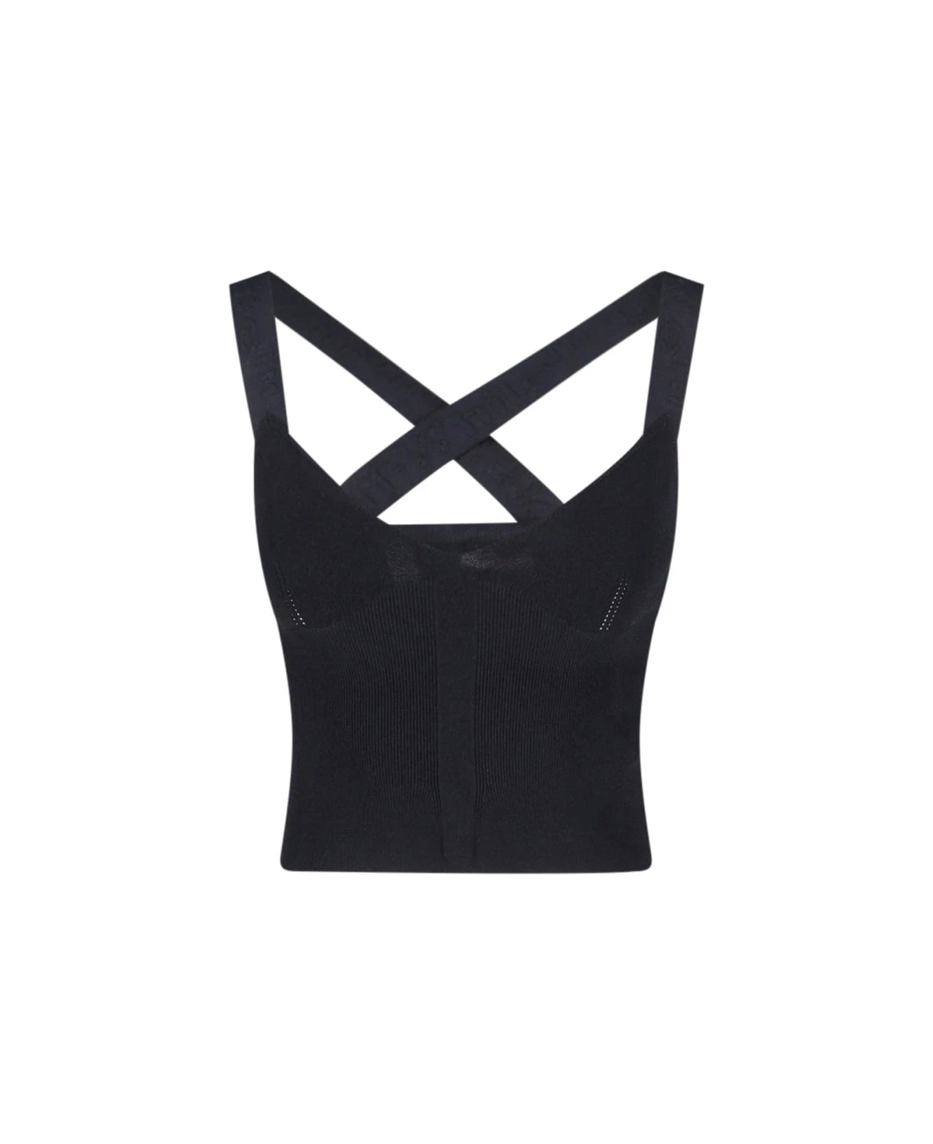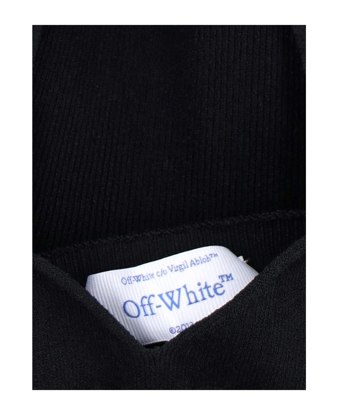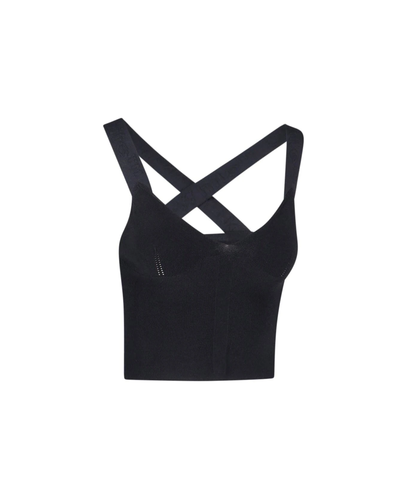 Off-White ‘V-Strap’ top in black stretch fabric with ribbed workmanship, crossed shoulder straps with tone-on-tone logo detail on the back, V-neck, crop length, and straight hem.