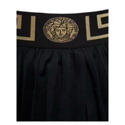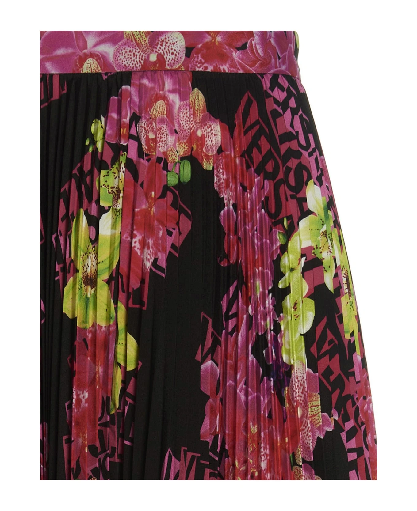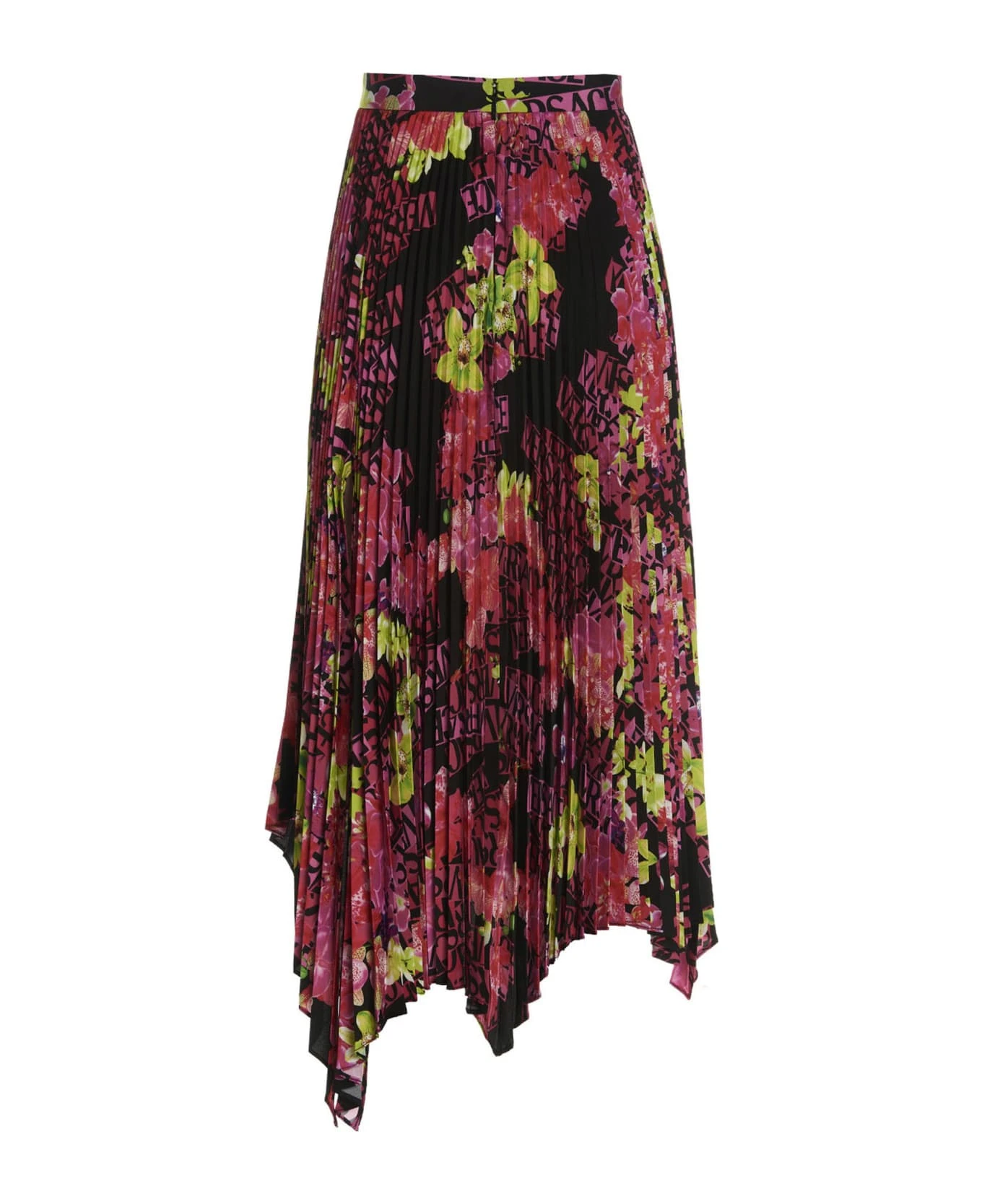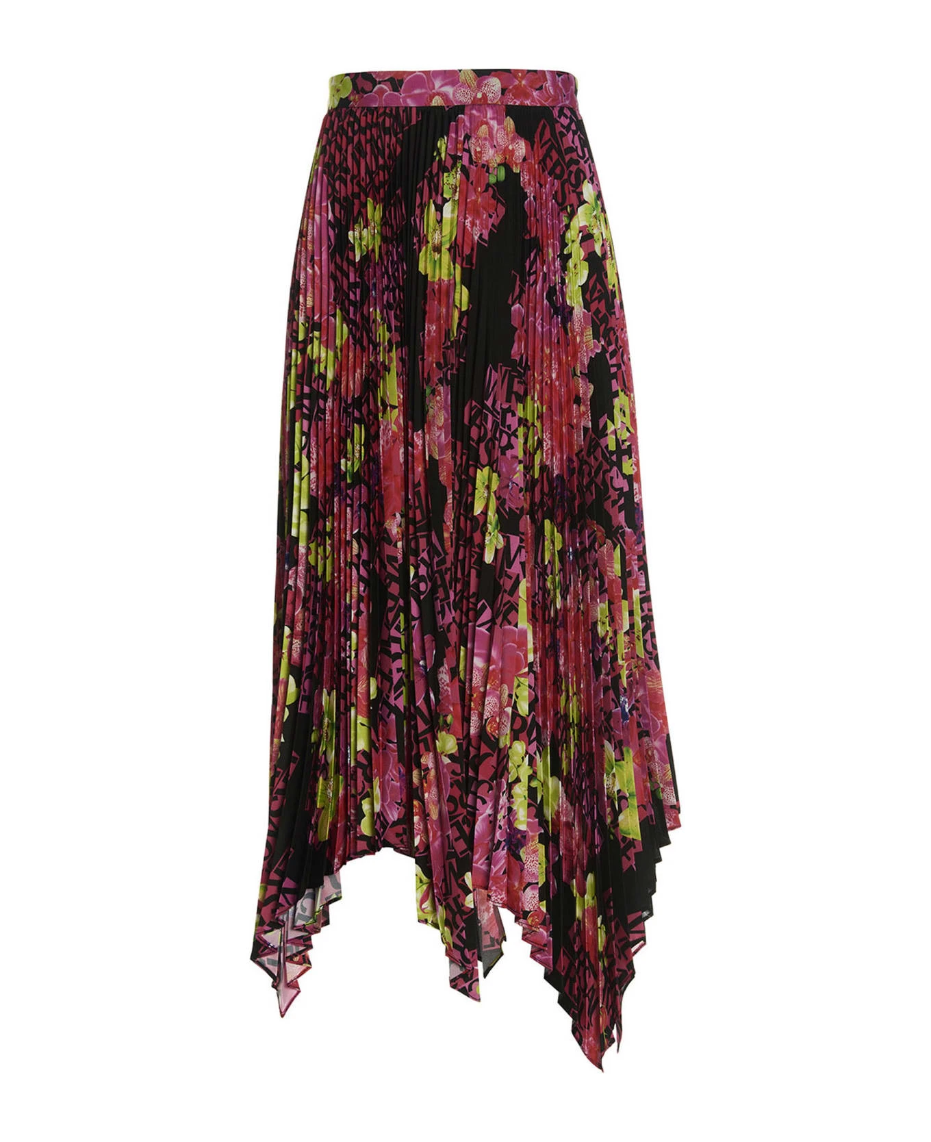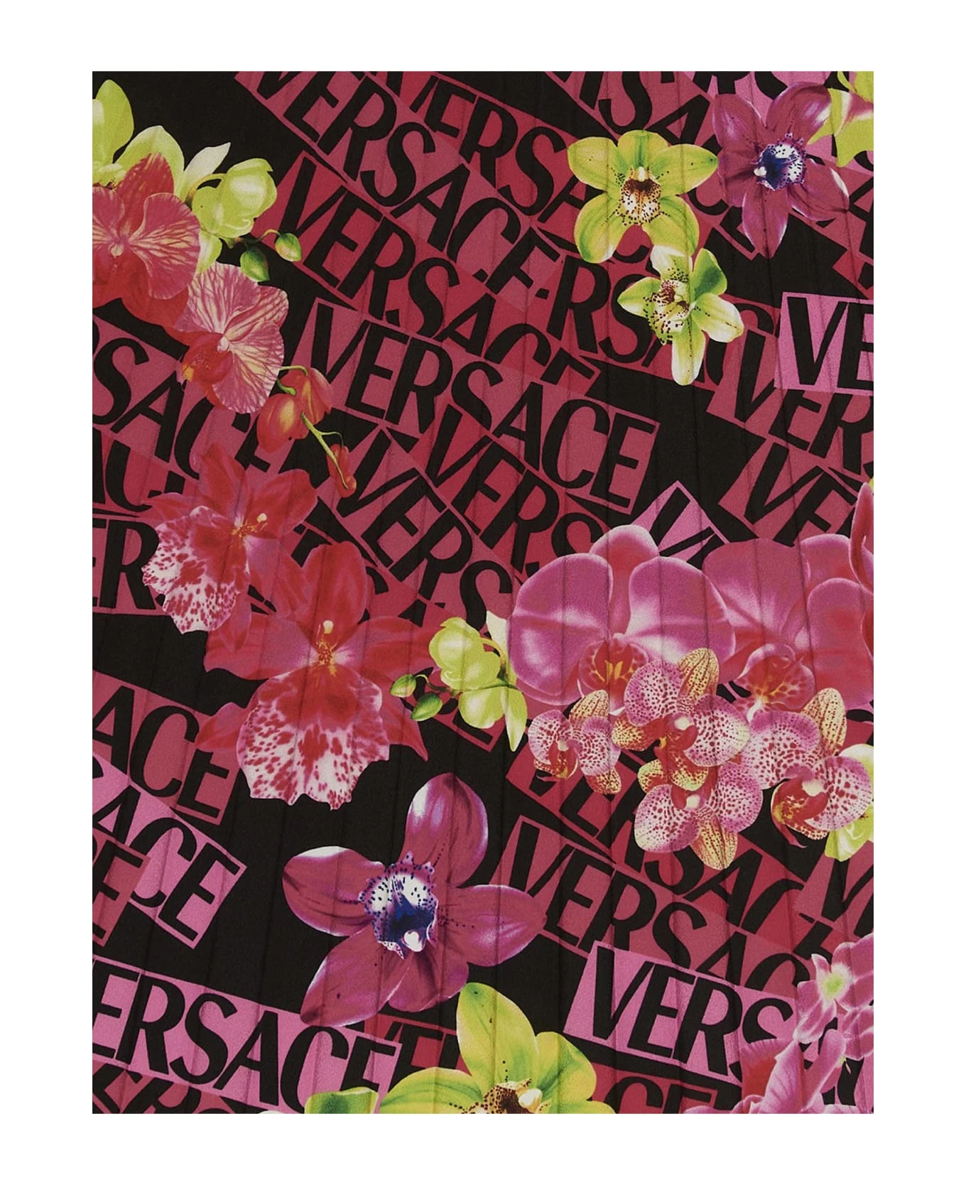 Pleated skirt with all-over ‘Orchid Versace’ print and side zip closure.