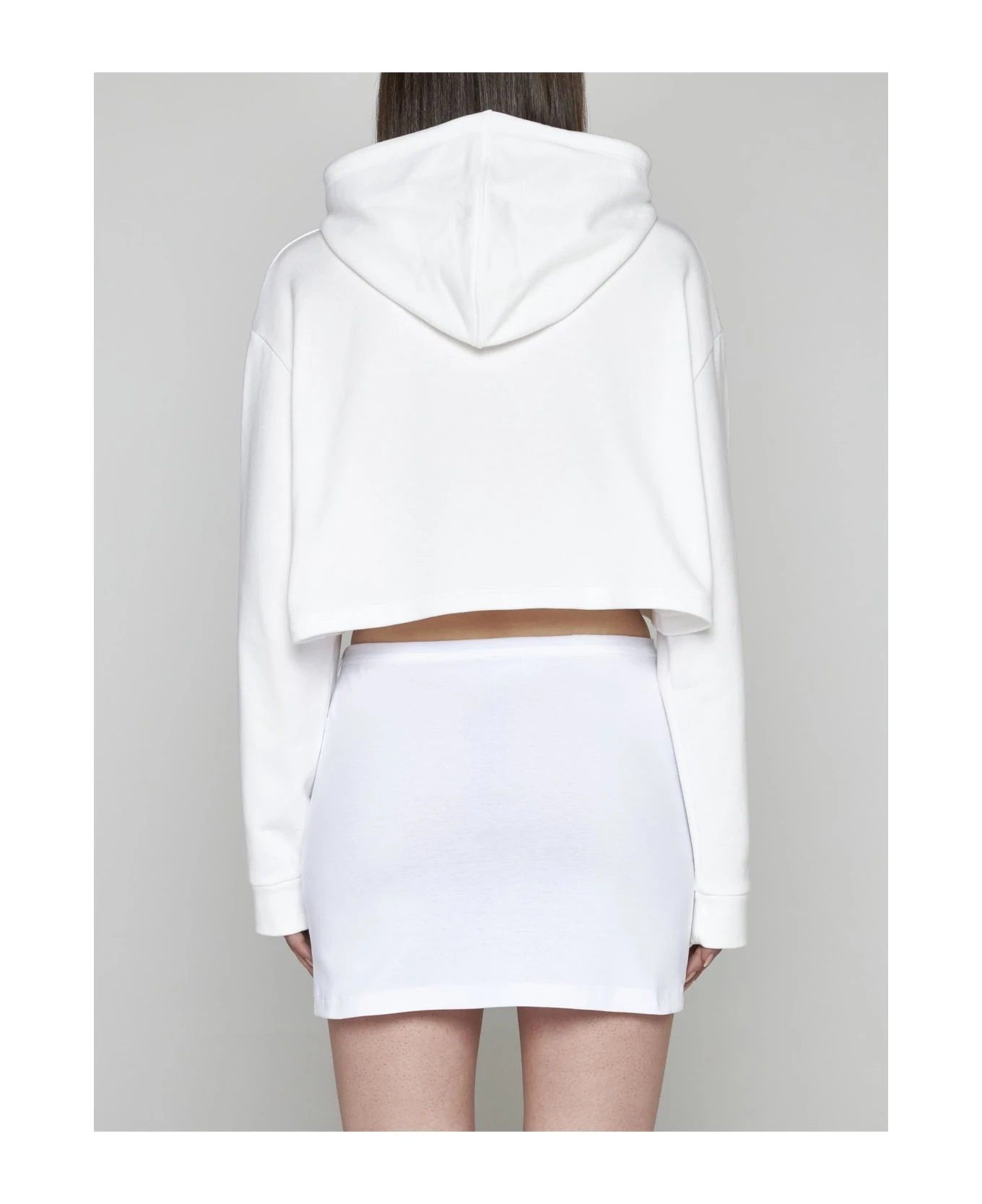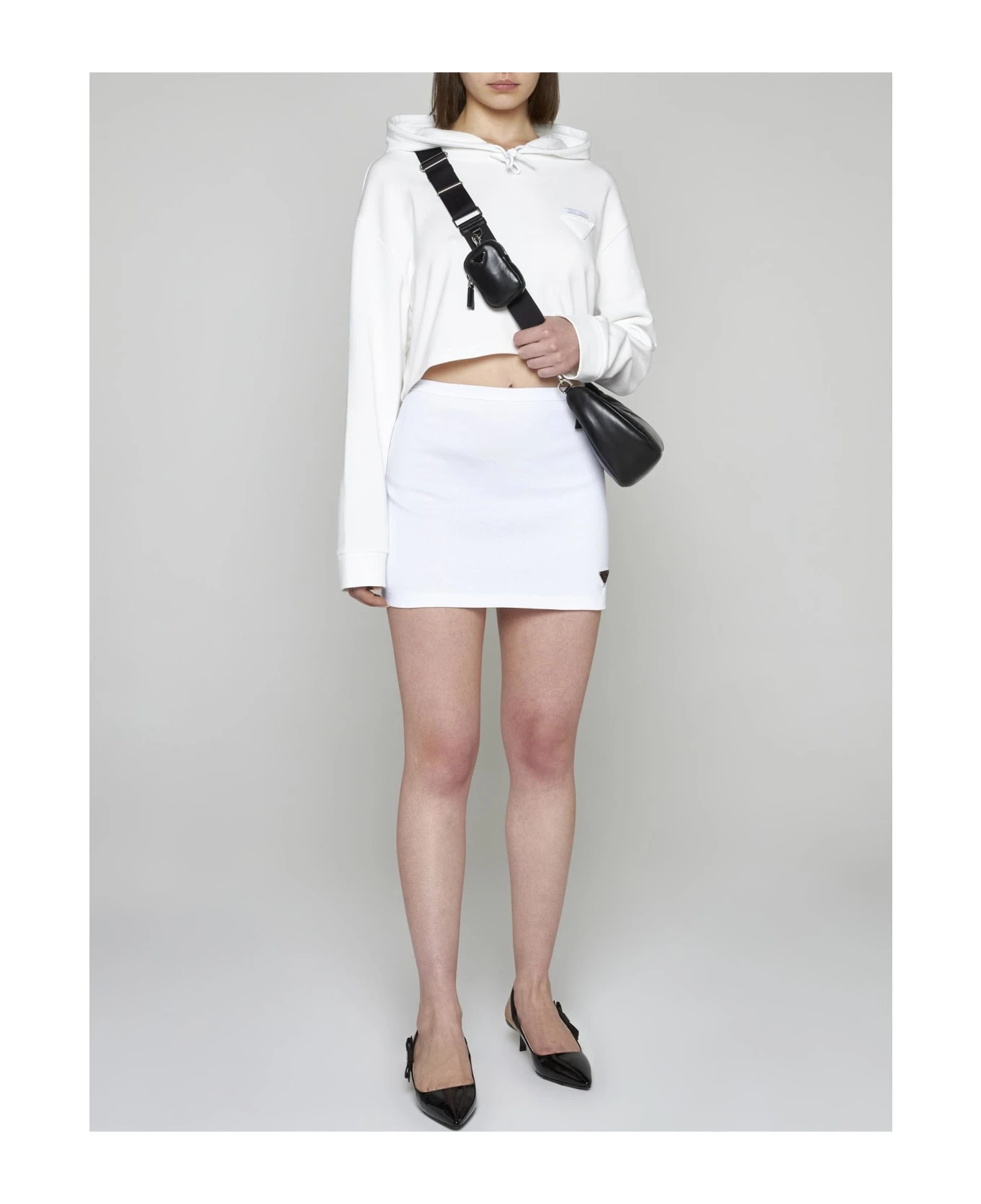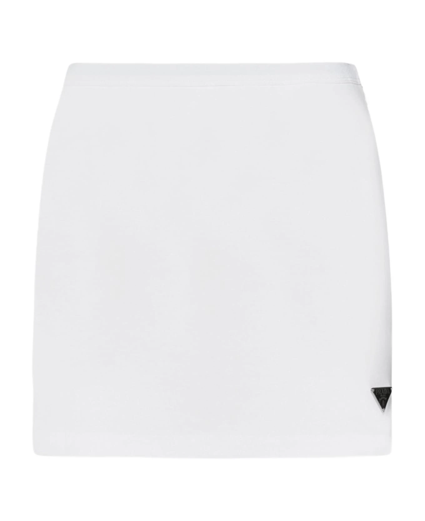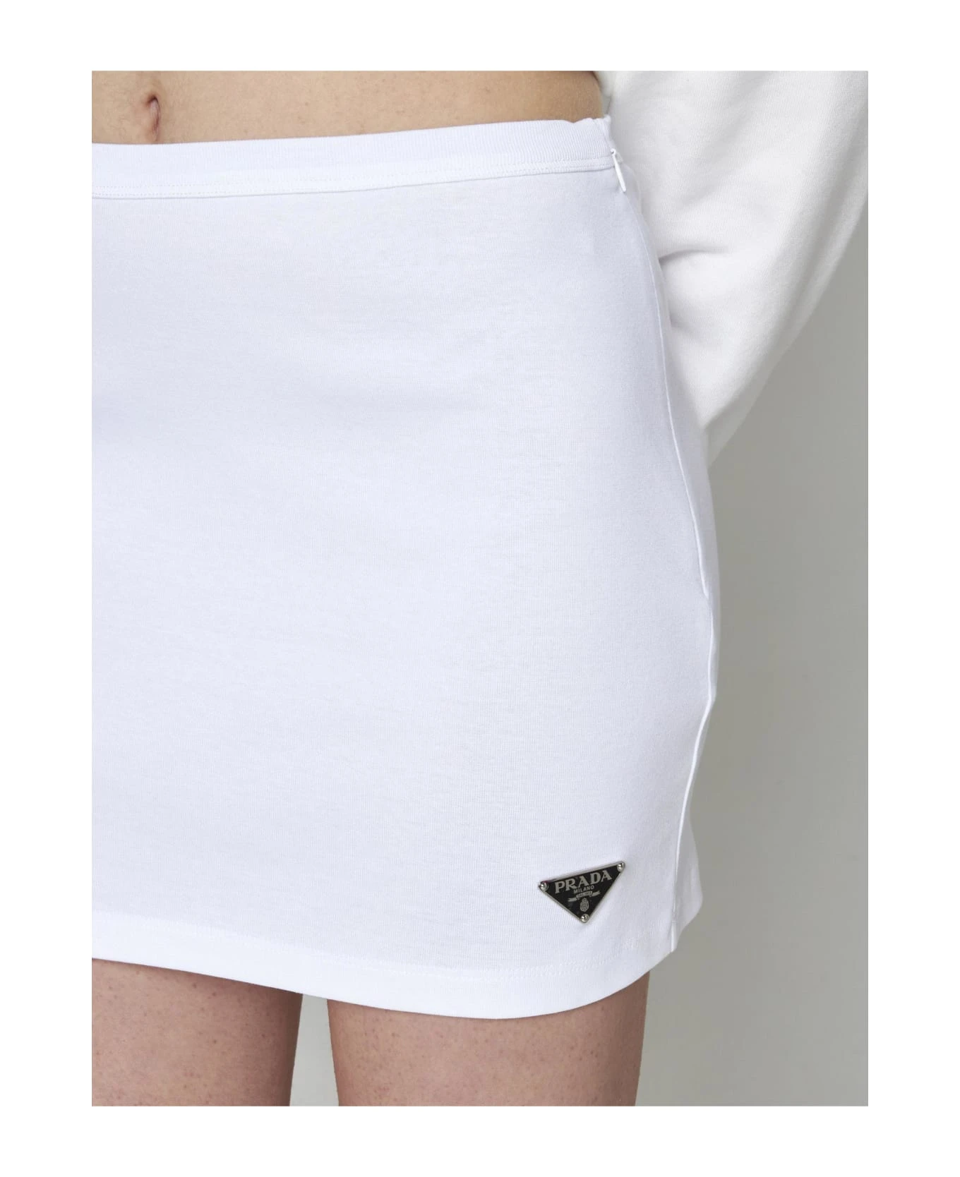 Prada’s white cotton miniskirt featuring a side zip fastening, enameled metal triangle logo plaque i and straight cut.