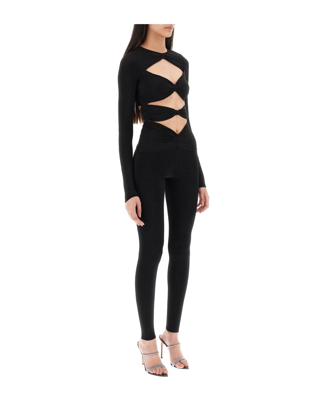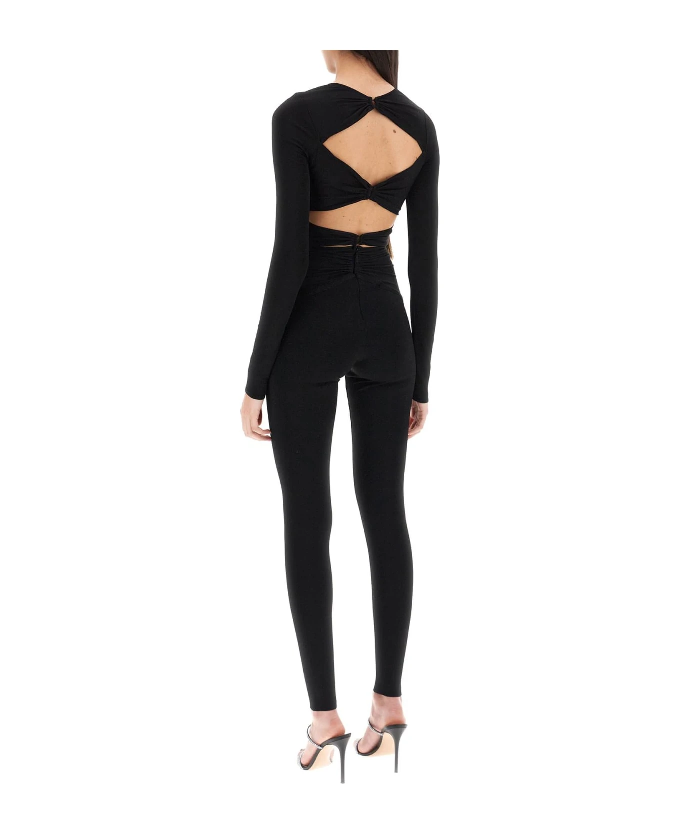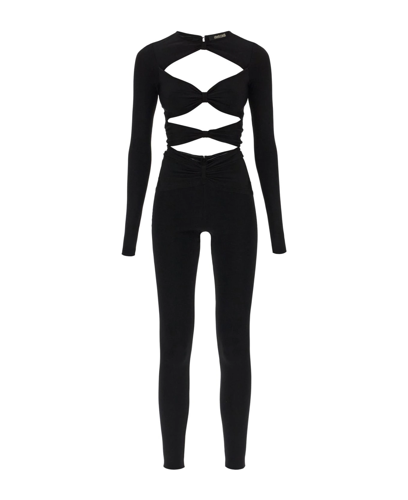 Roberto Cavalli jumpsuit crafted in stretch viscose blend knit. Characterized by front and back cut-outs, this garment features long sleeves, crew-neck and back invisible zipper and hooks closure. Waisted fit. The model is 177 cm tall and wears size IT 40.