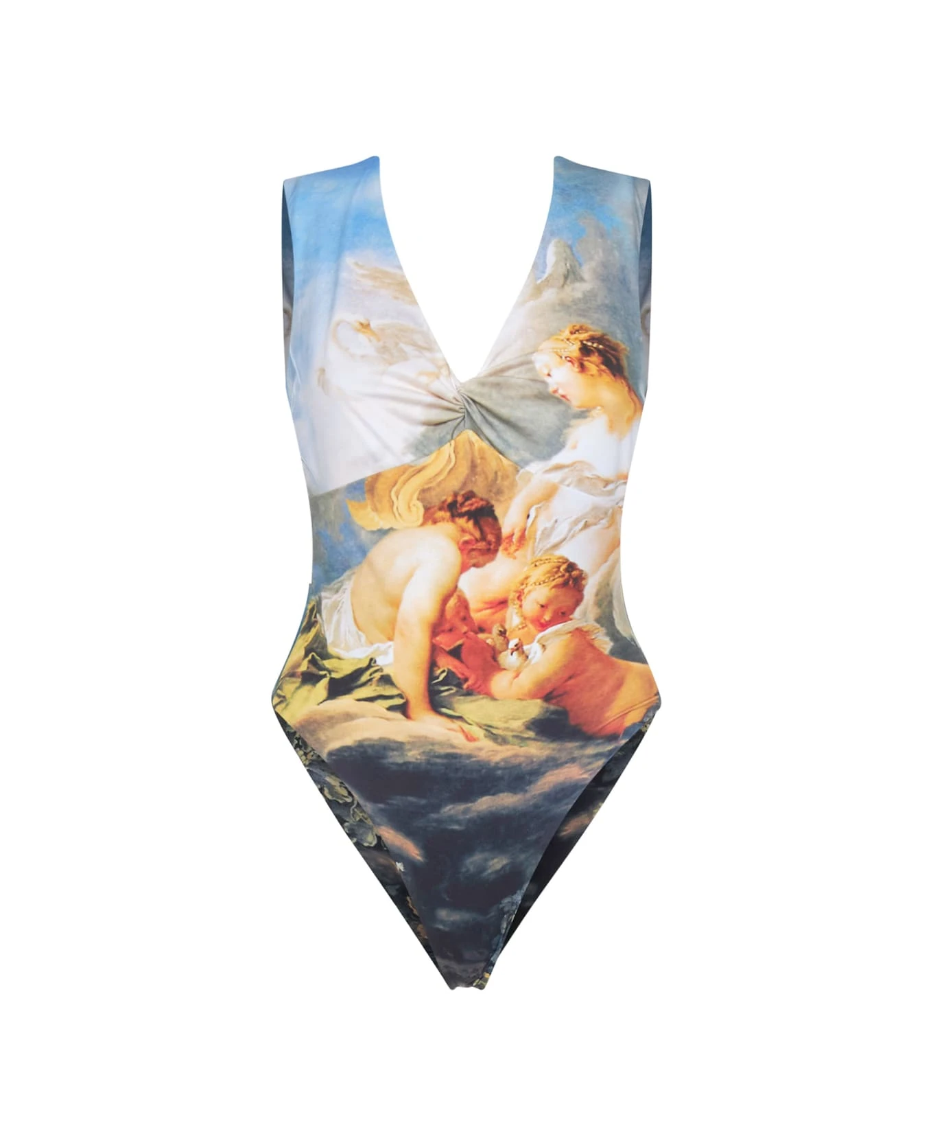 Decorated with baroque figures hovering between heaven and earth, this Roberto Cavalli one-piece swimwear follows a slimming silhouette, with ruffles on the chest and a deep V-neckline on the front and back.