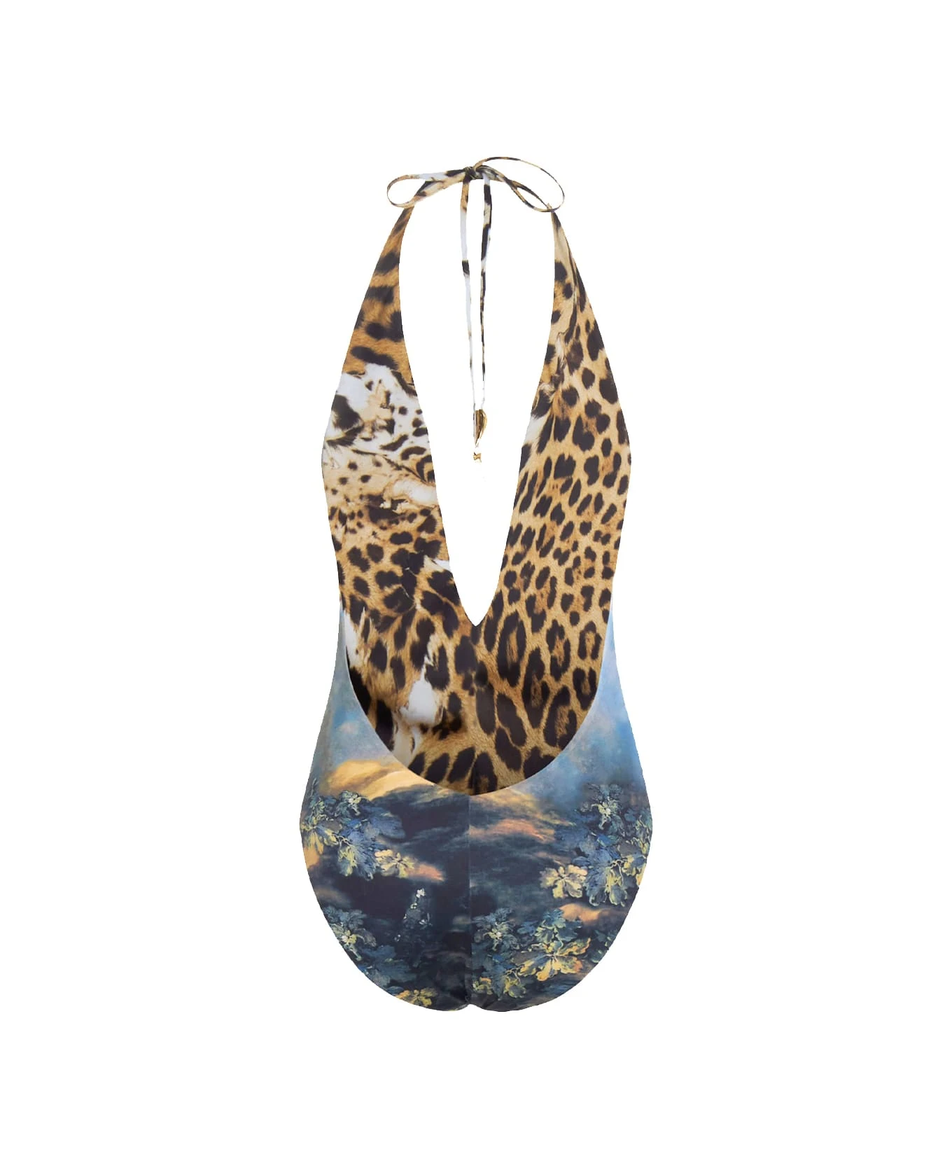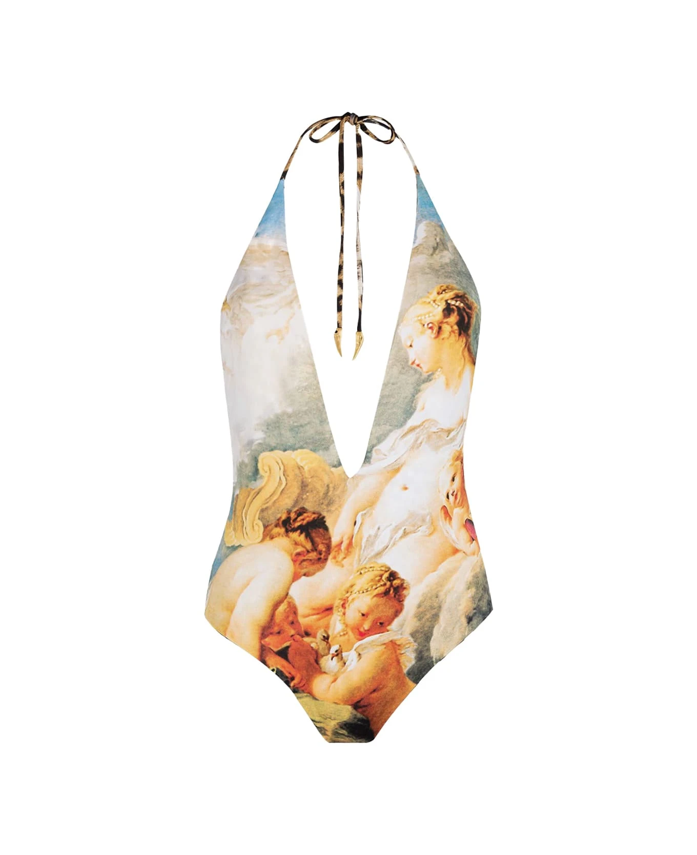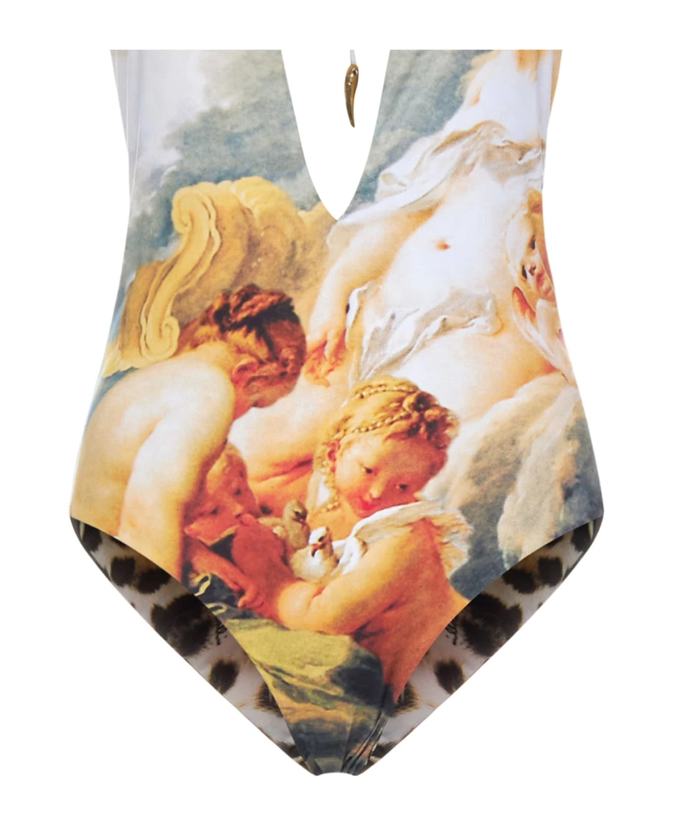 A sumptuous Baroque-inspired print and a vertiginous V-neckline: this Roberto Cavalli one-piece swimwear embodies the proud and seductive spirit that distinguishes the Maison. Model with an open back and lacing at the back. The animal print laces and gold tusk detailing are an explicit nod to the brand’s signature feline themes.