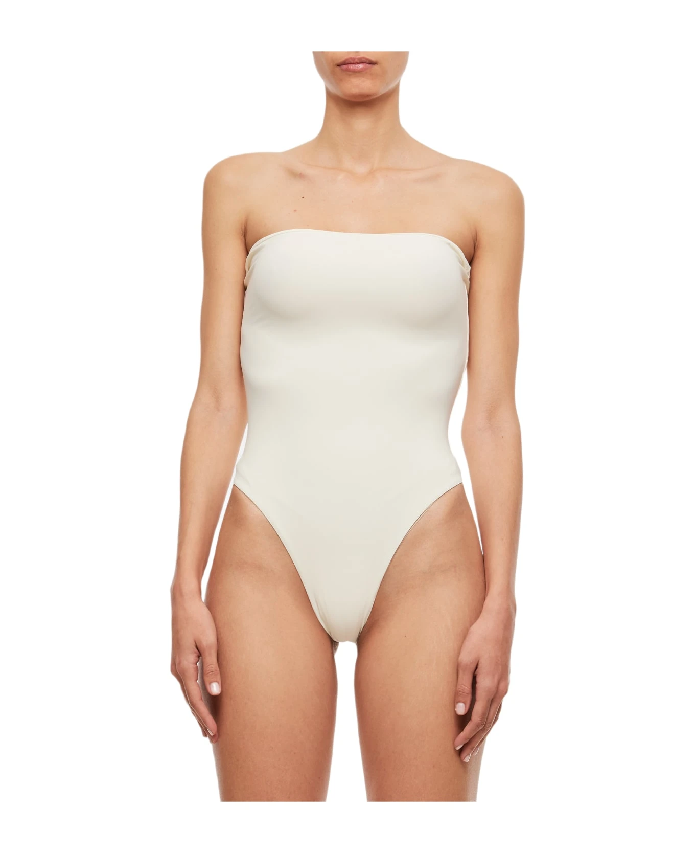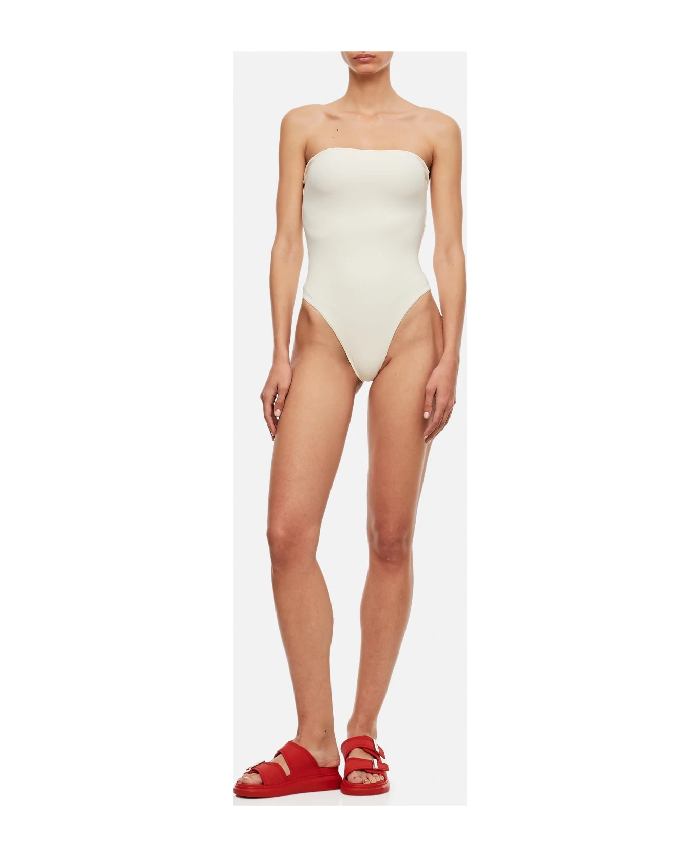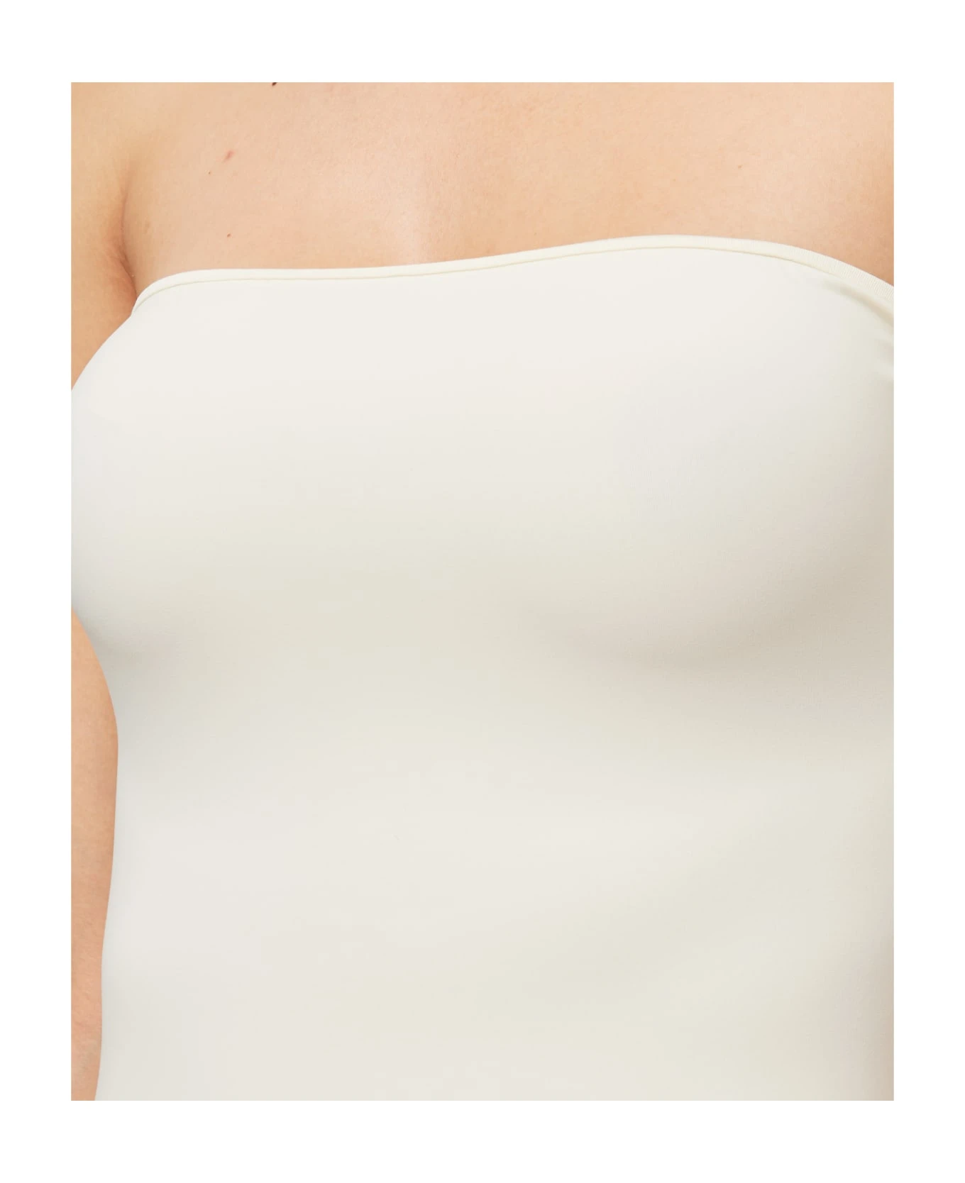 Strapless silhouette Made with quick-drying stretch Lycra Bandeau neckline High leg cut Color: white.