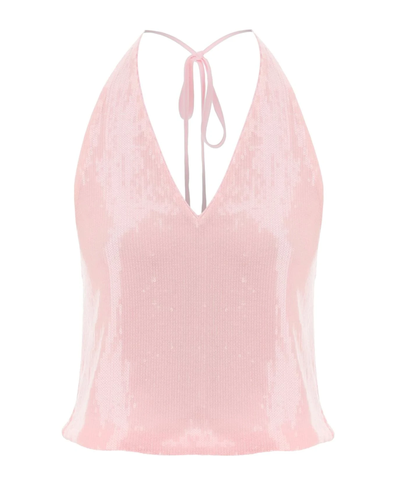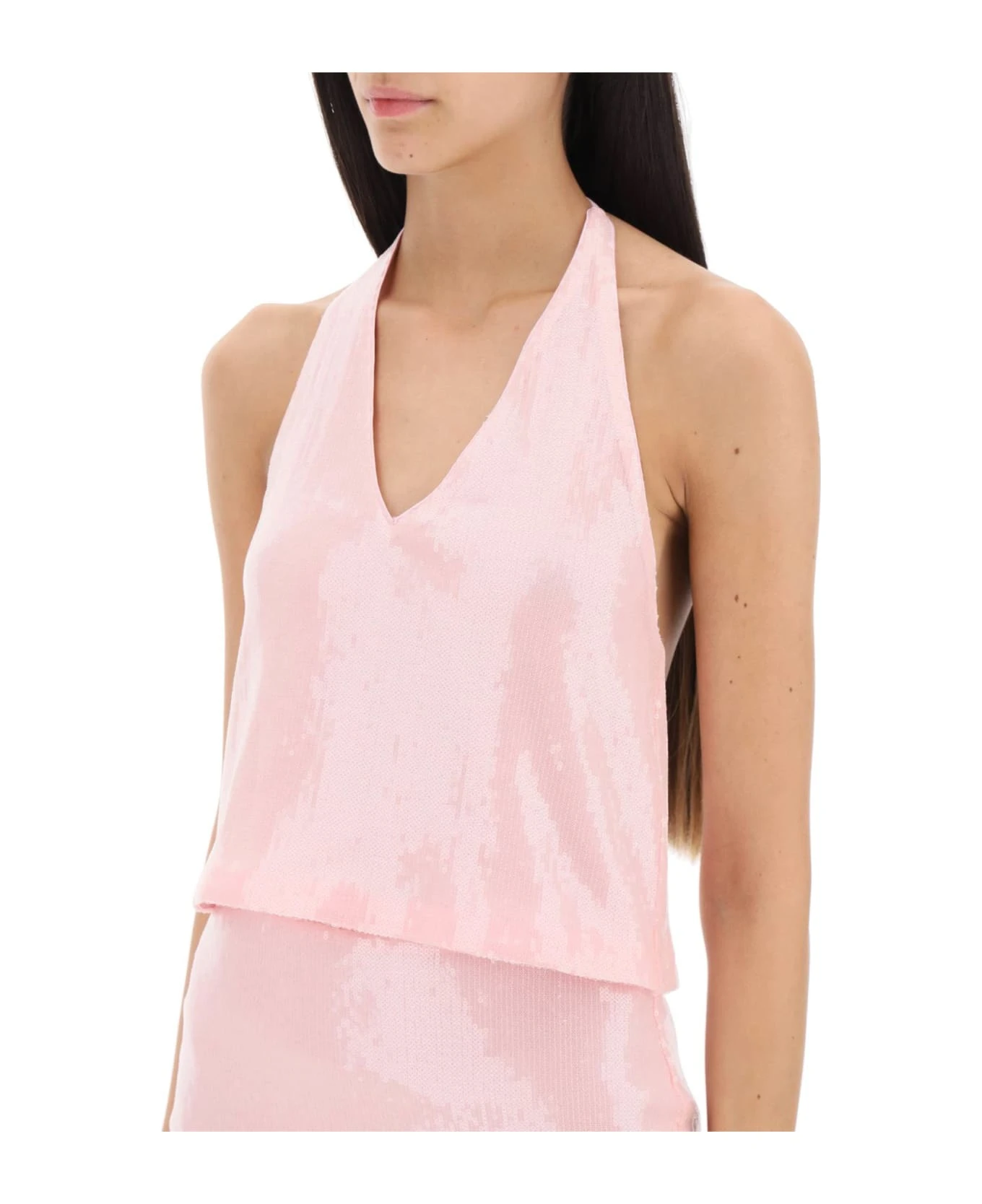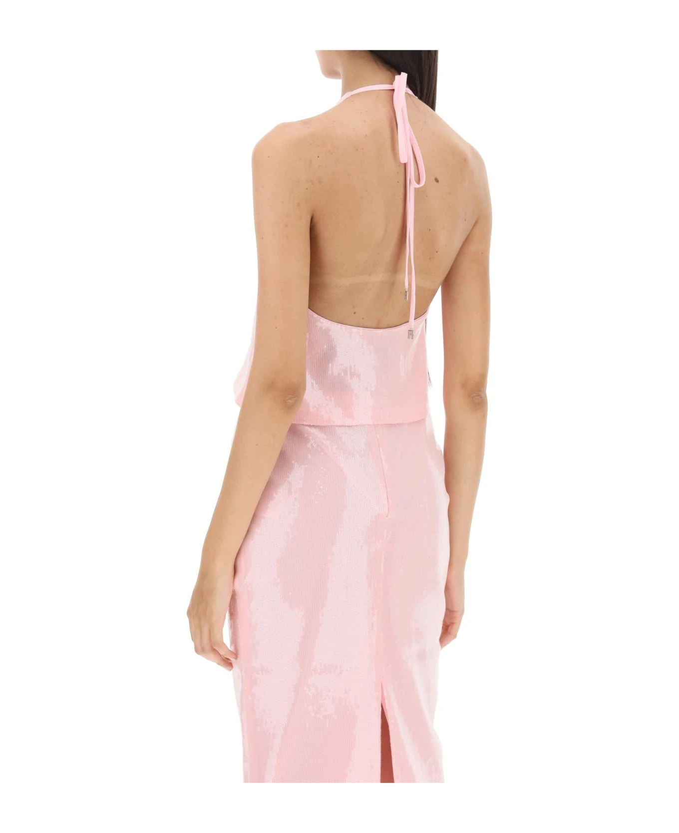 Rotate halterneck top entirely covered with micro sequins for a lustrous finish. LIned in lightweight stretch jersey, it features back ties detailed with metal monogram charms. The model is 177 cm tall and wears a size EU 36.