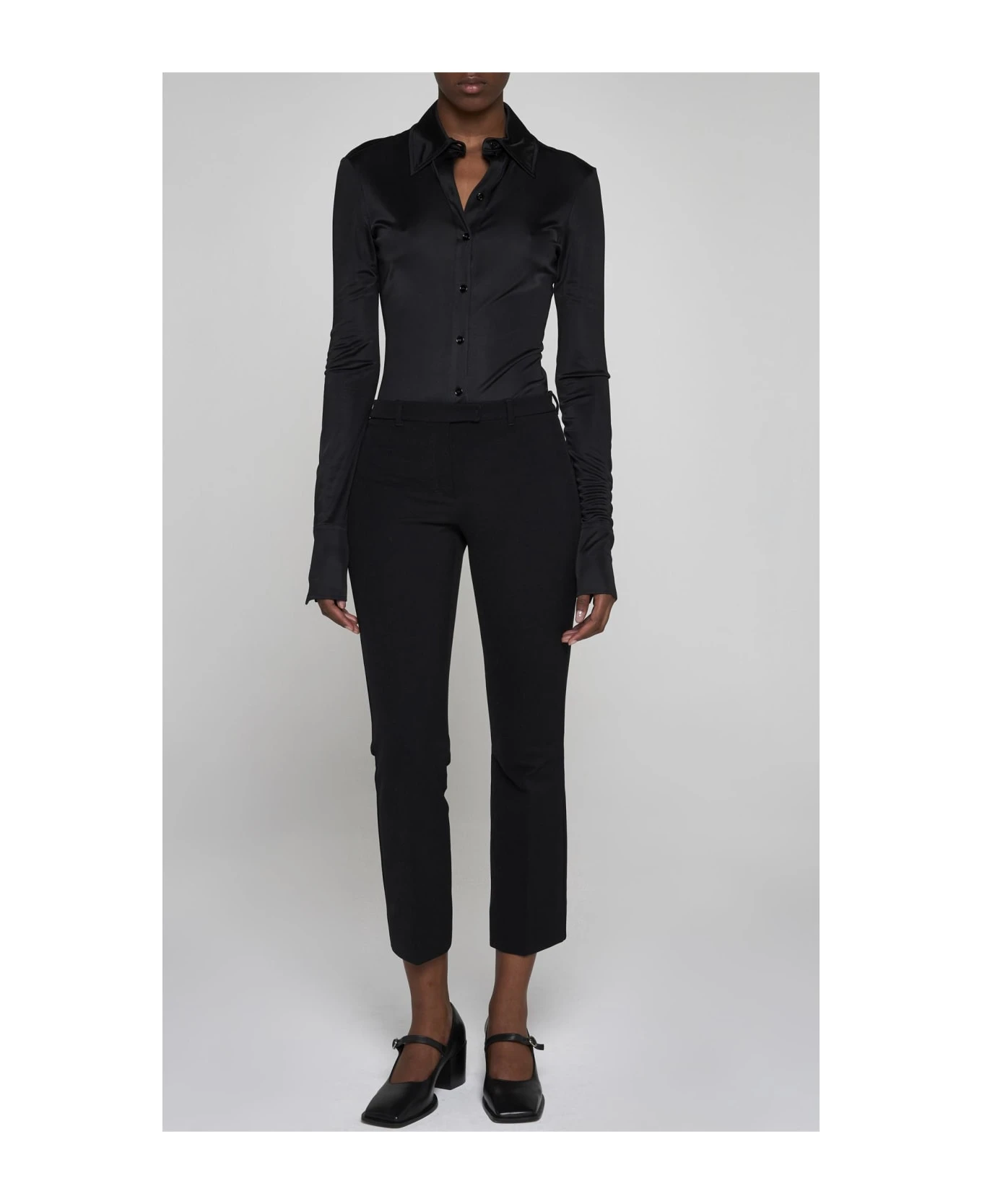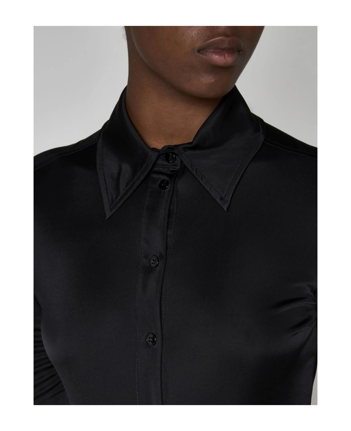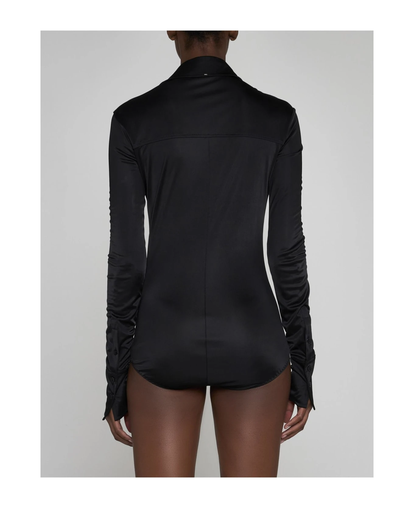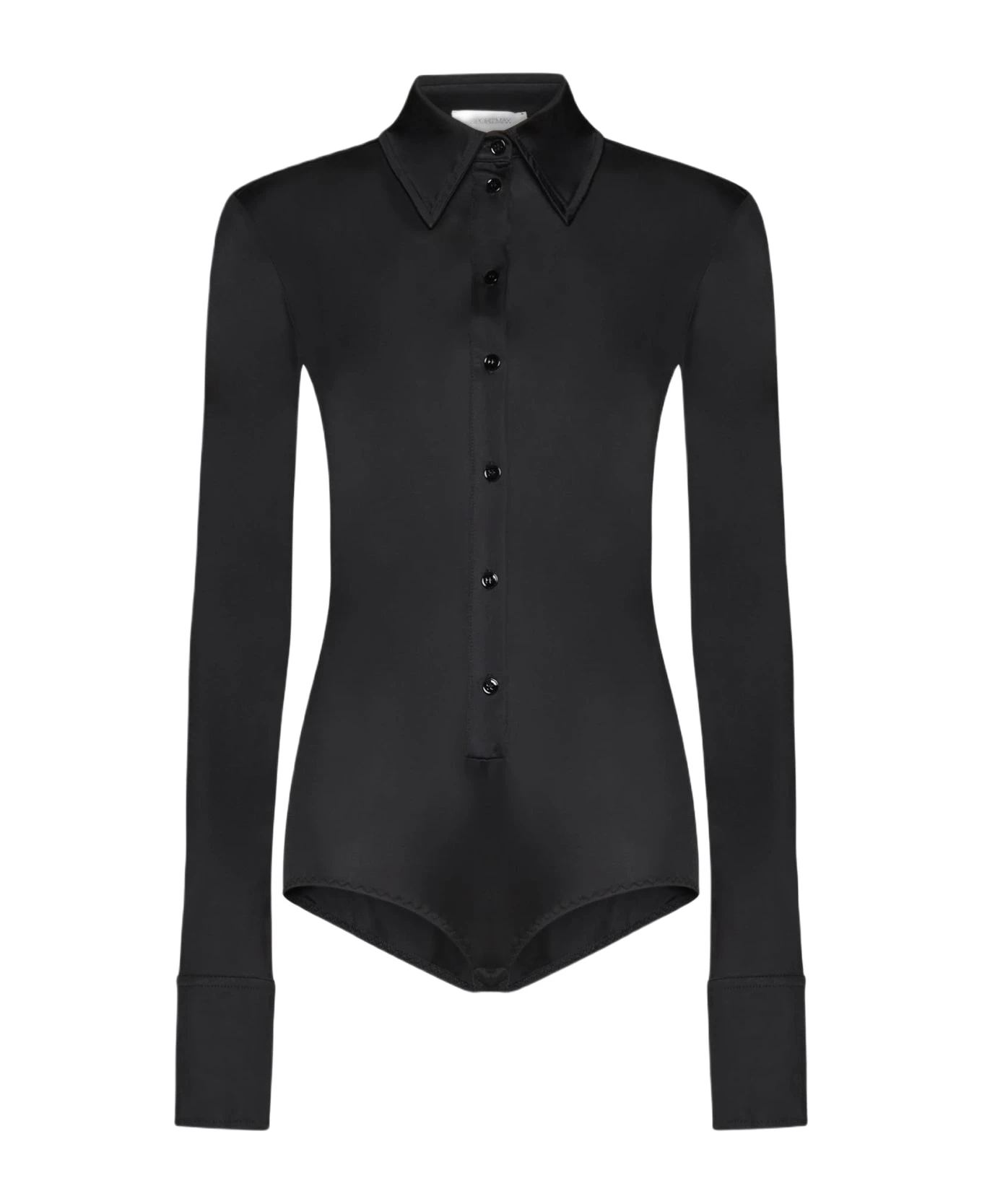 Sportmax’s Pera black viscose bodysuit featuring a pointed collar, front and cuffs buttoning, fitted silhouette and logo plaque on the back.