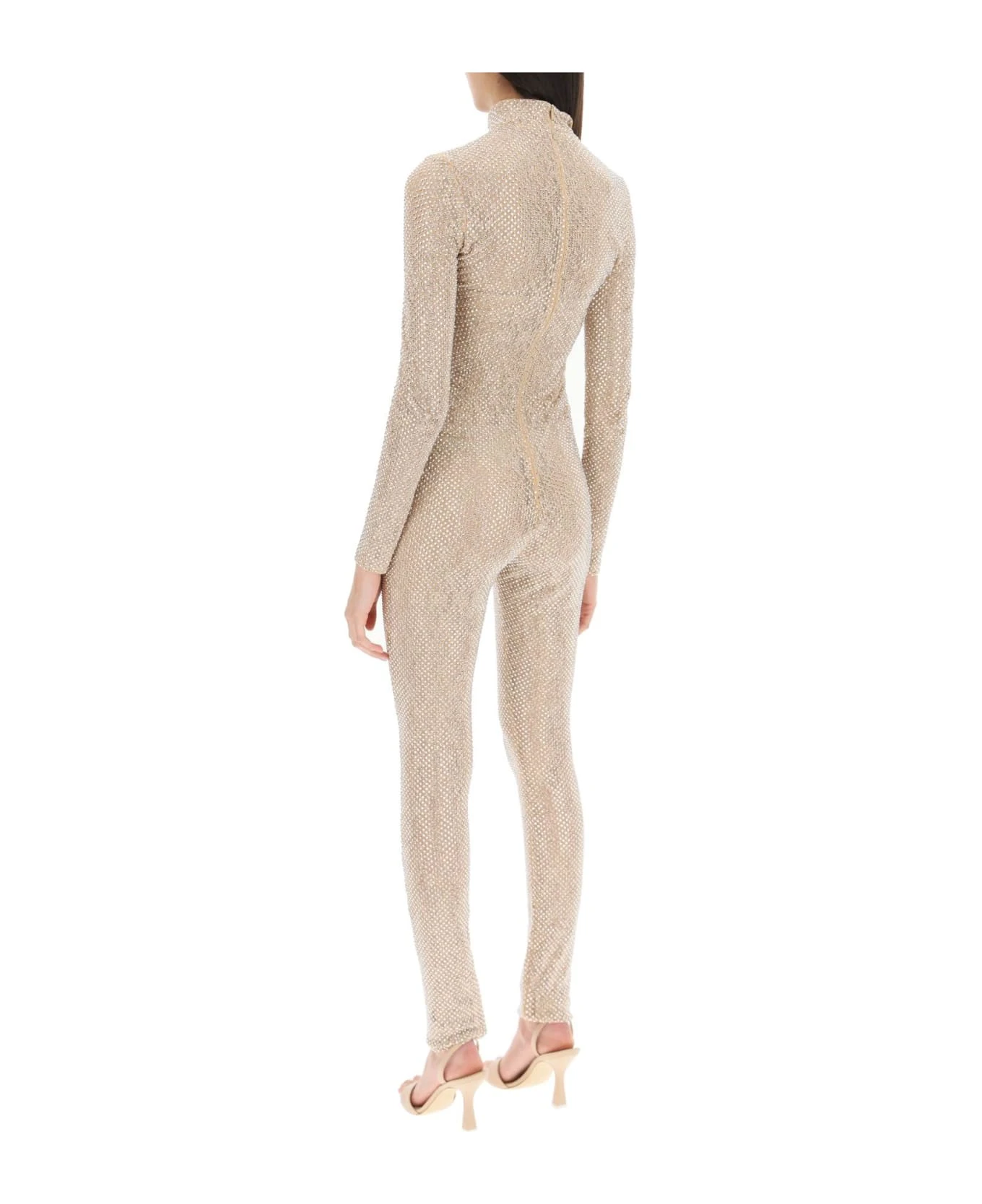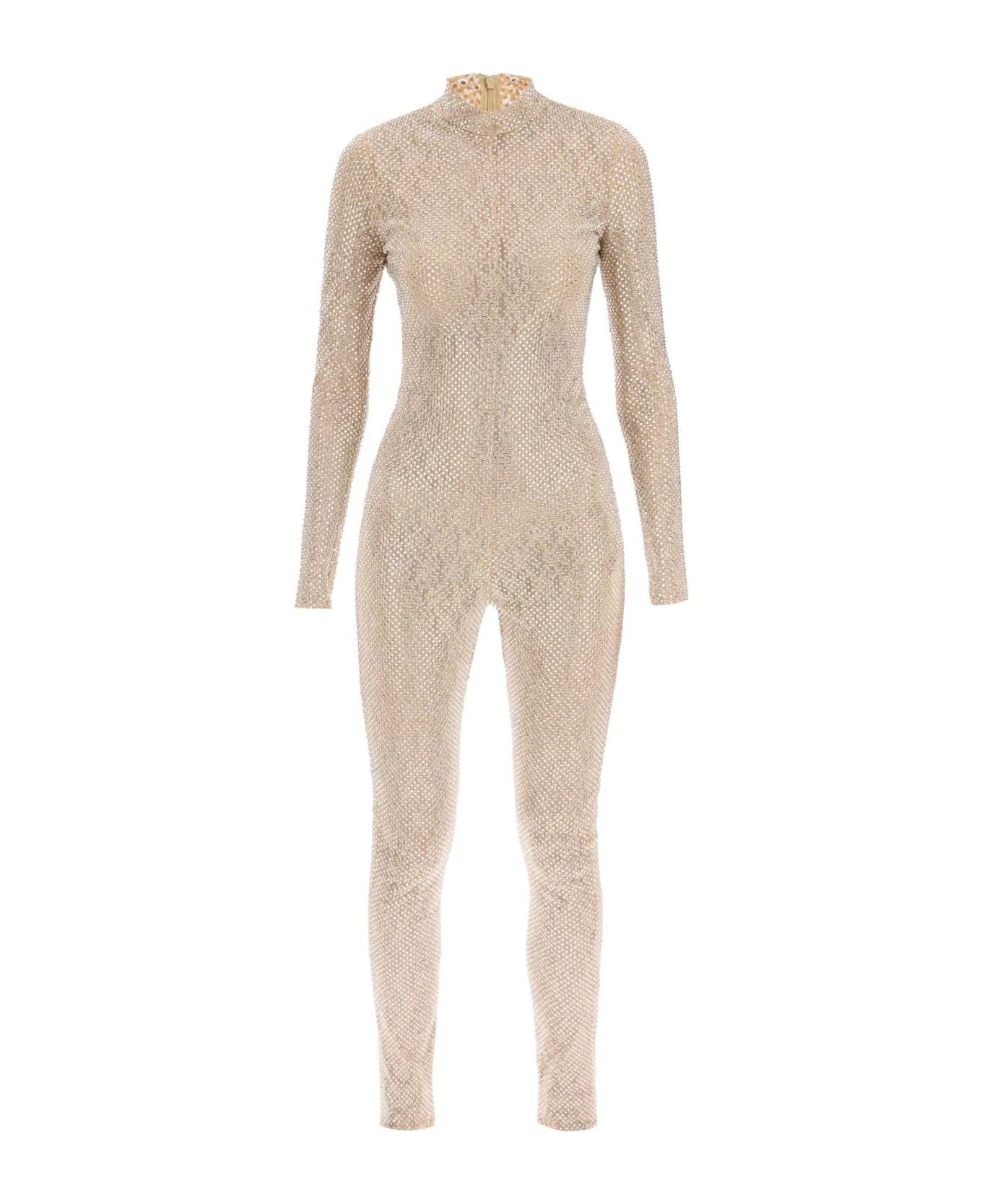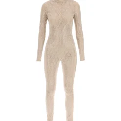 Stella McCartney floral lace jumpsuit entirely covered with rhinestones. Shaped to a second-skin fitted silhouette, it features long sleeves, mock neck, and invisible zippers at the back and ankles. The model is 177 cm tall and wears a size IT 40.