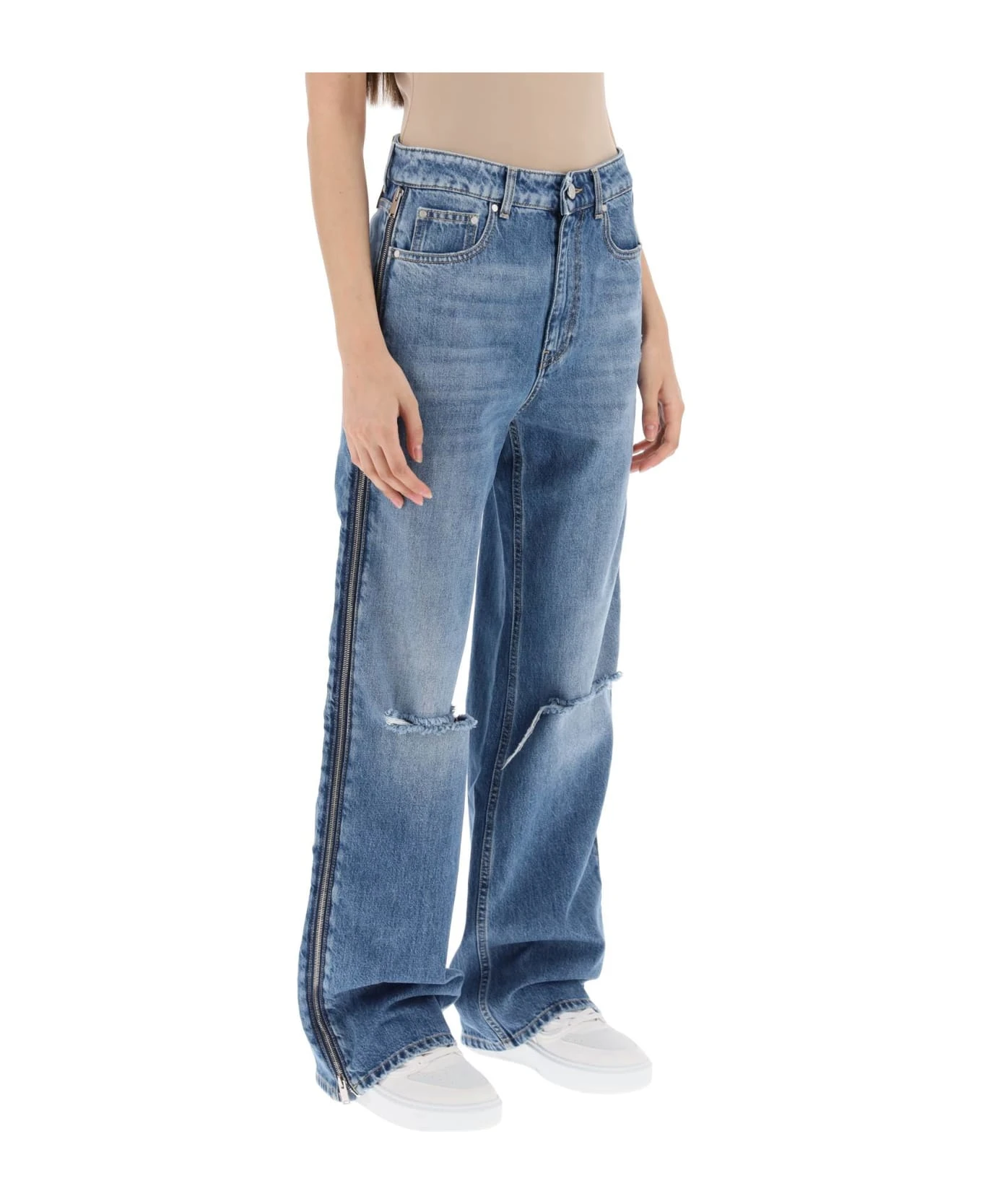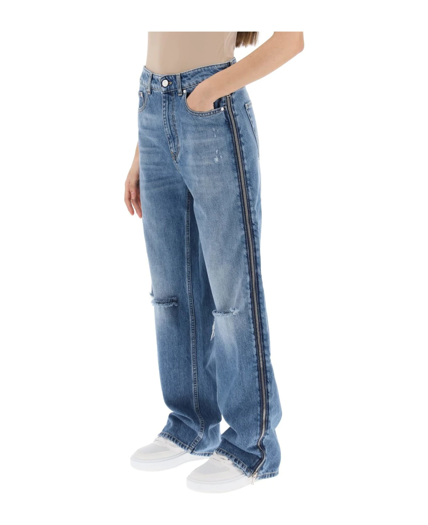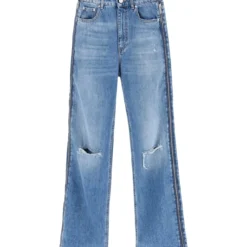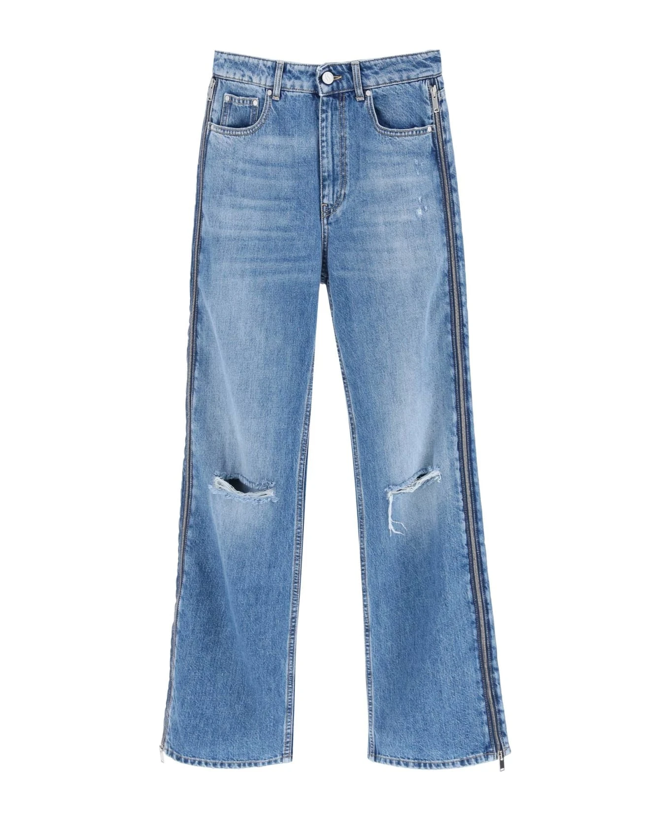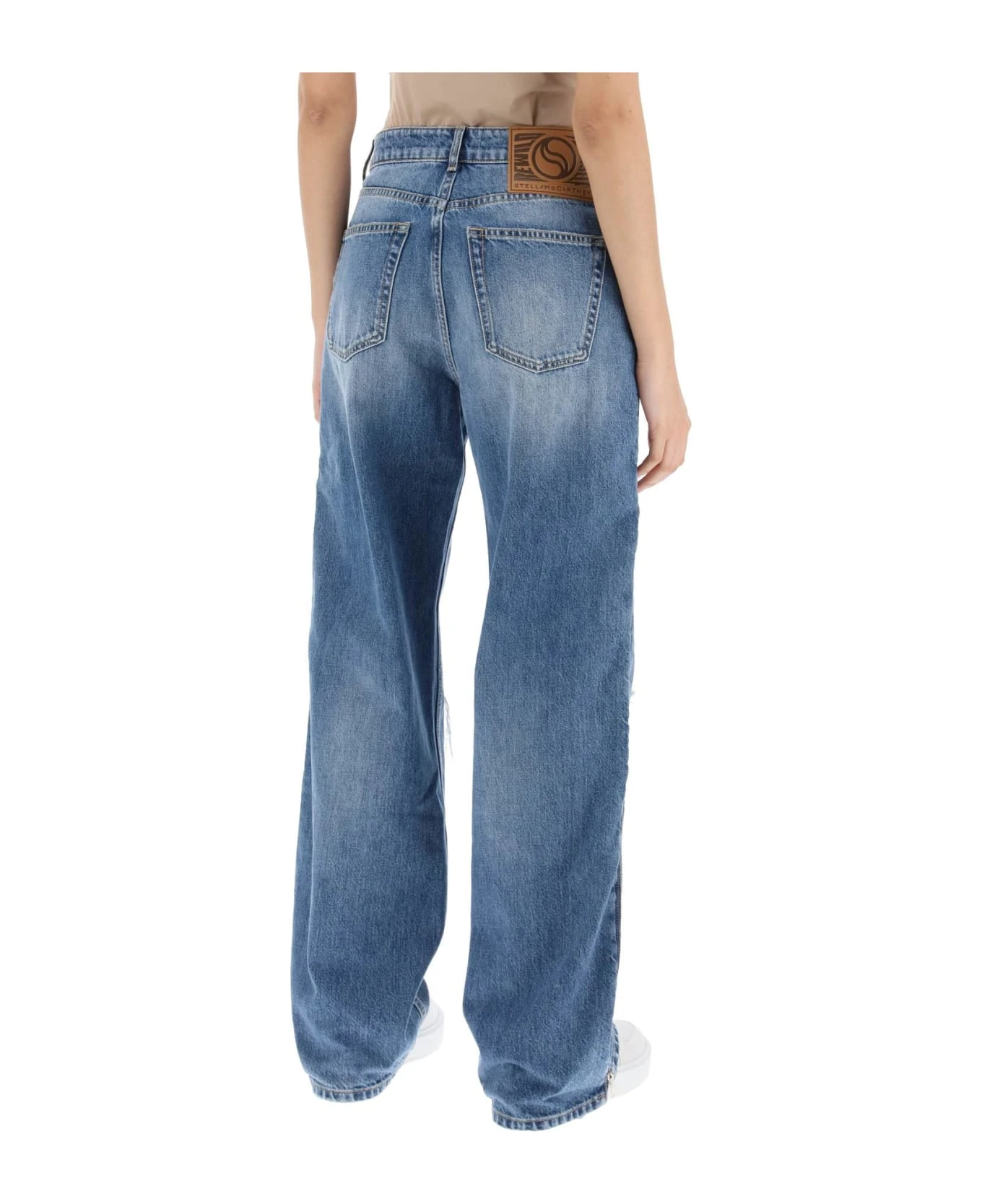 Stella McCartney jeans crafted in pure organic cotton with medium vintage wash and destroyed details at knees. Five-pocket style with straight leg and adjustable fit with gussetted insert and two-way zippers along the side. It features zipper and button fly and back jacron with ‘S-Wave’ logo. Relaxed fit. The model is 177 cm tall and wears size 26.