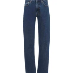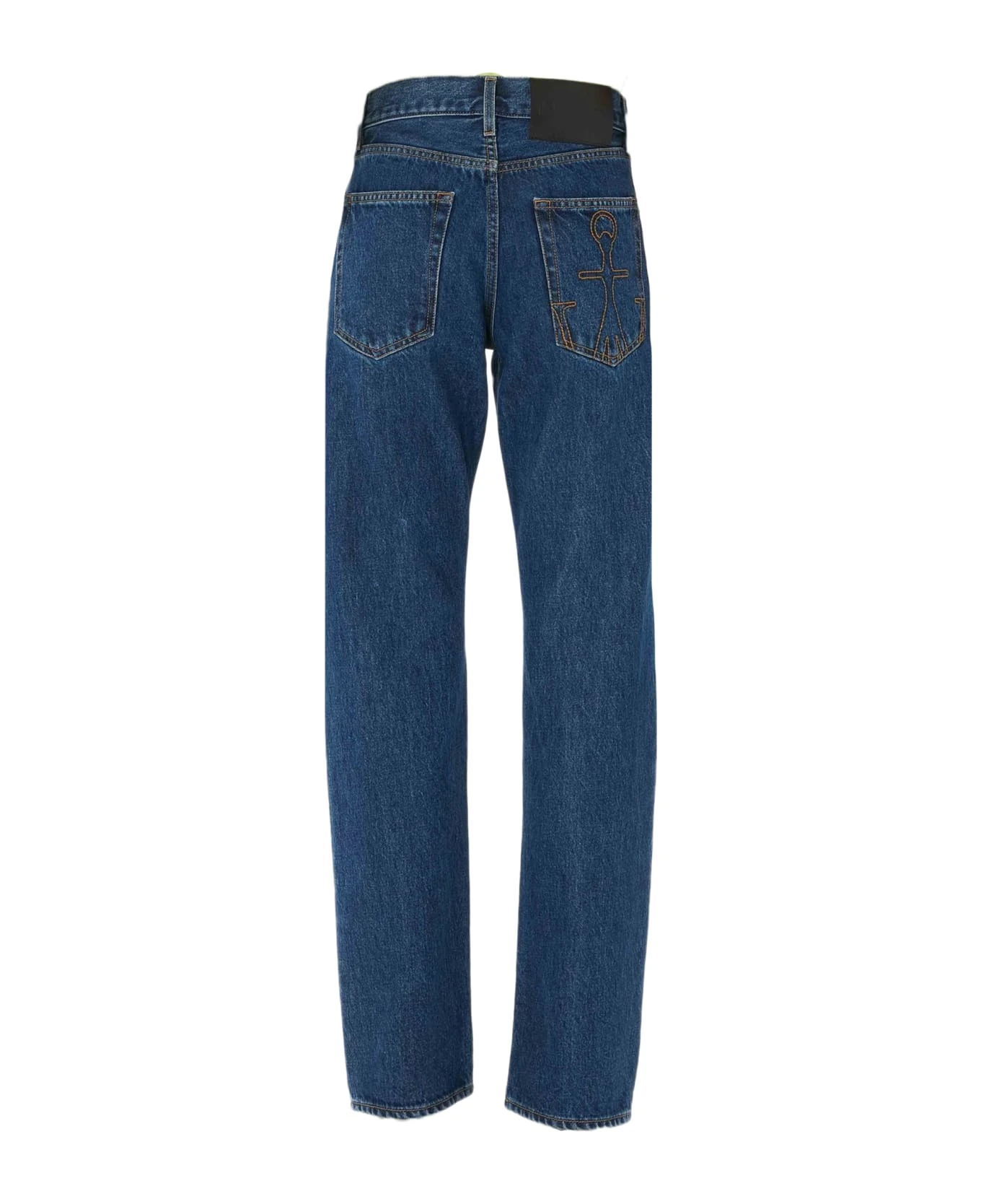 Straight leg jeans in blue denim, mid waisted, contrast tobacco topstitching, anchor profile stitch on back patch pocket, black logo embossed leather patch, silver hardware