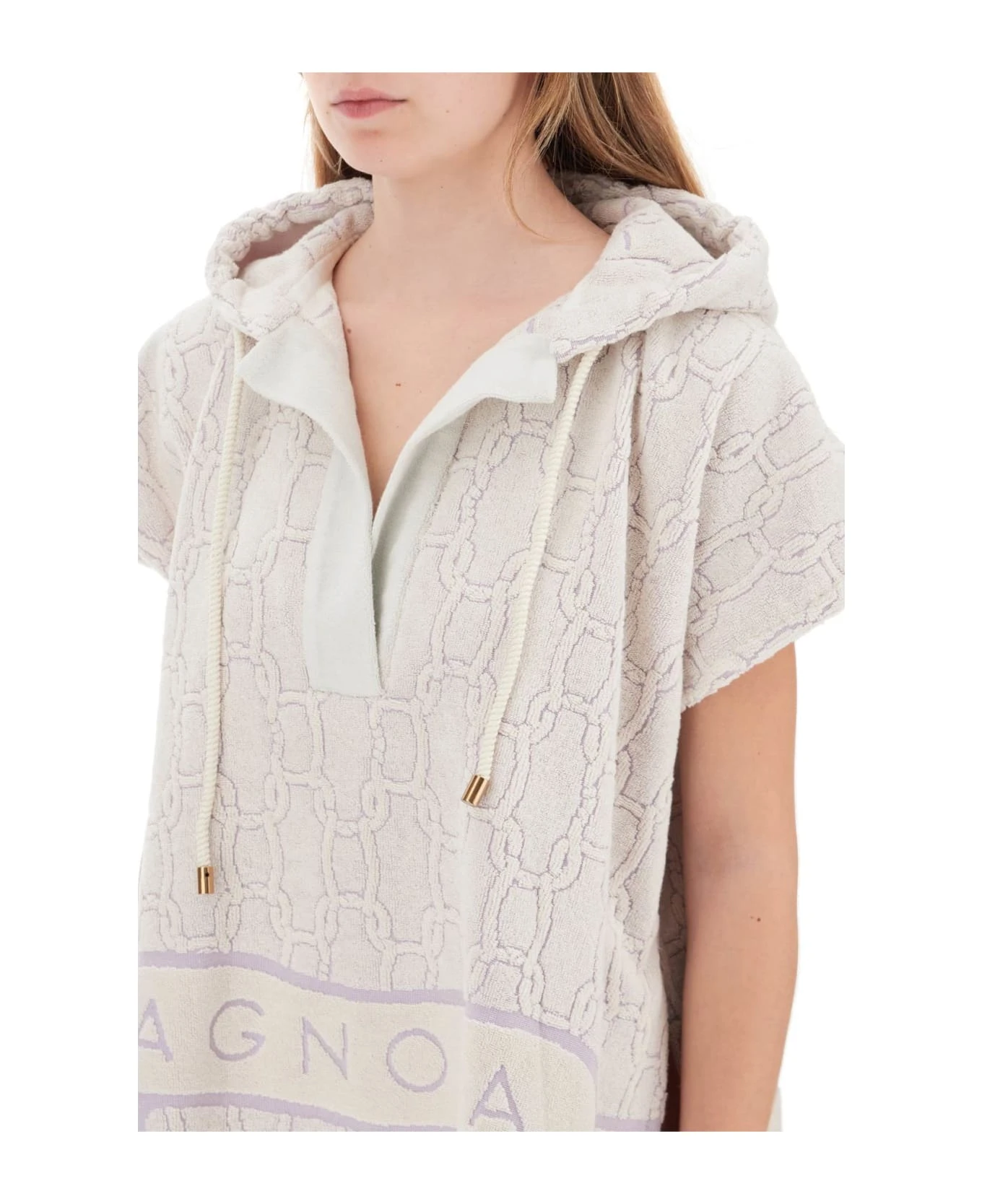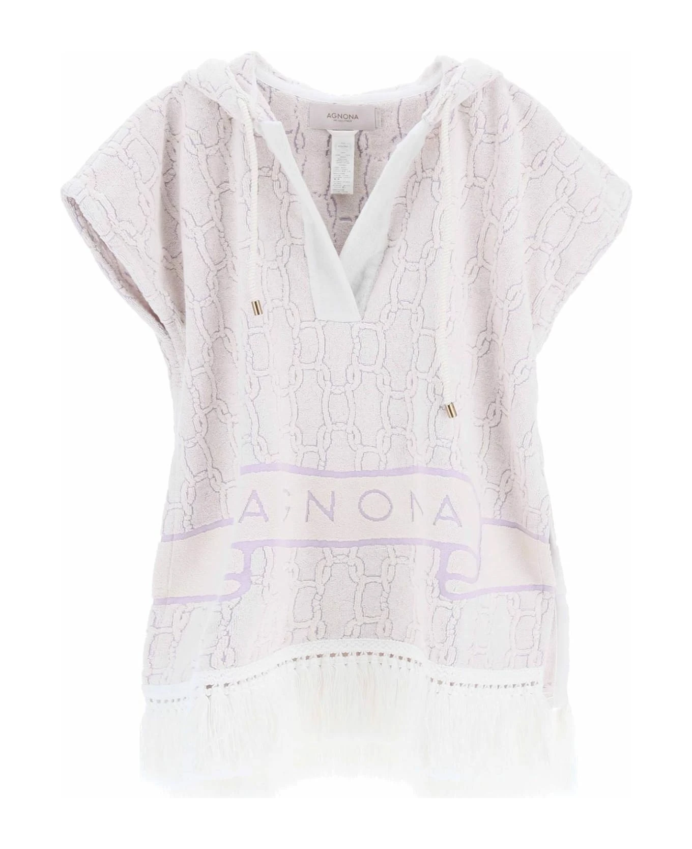 Agnona poncho crafted in pure cotton terry with chain logo motif all-over. It features a squared construction, adjustable hoodie with drawstring and V-neck. Finished with hand-applied fringes at the hem. Loose fit, mini length. This item is one size.