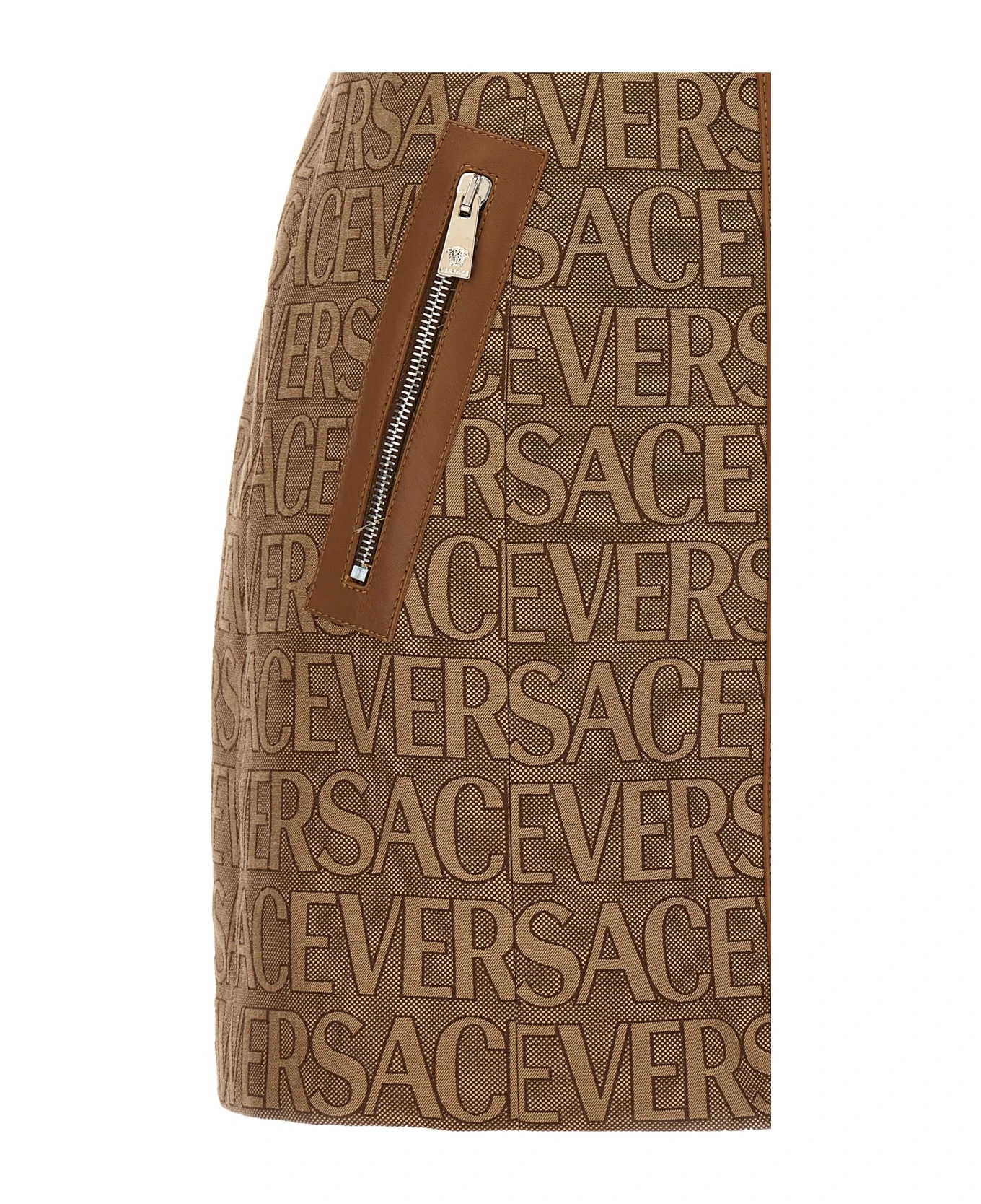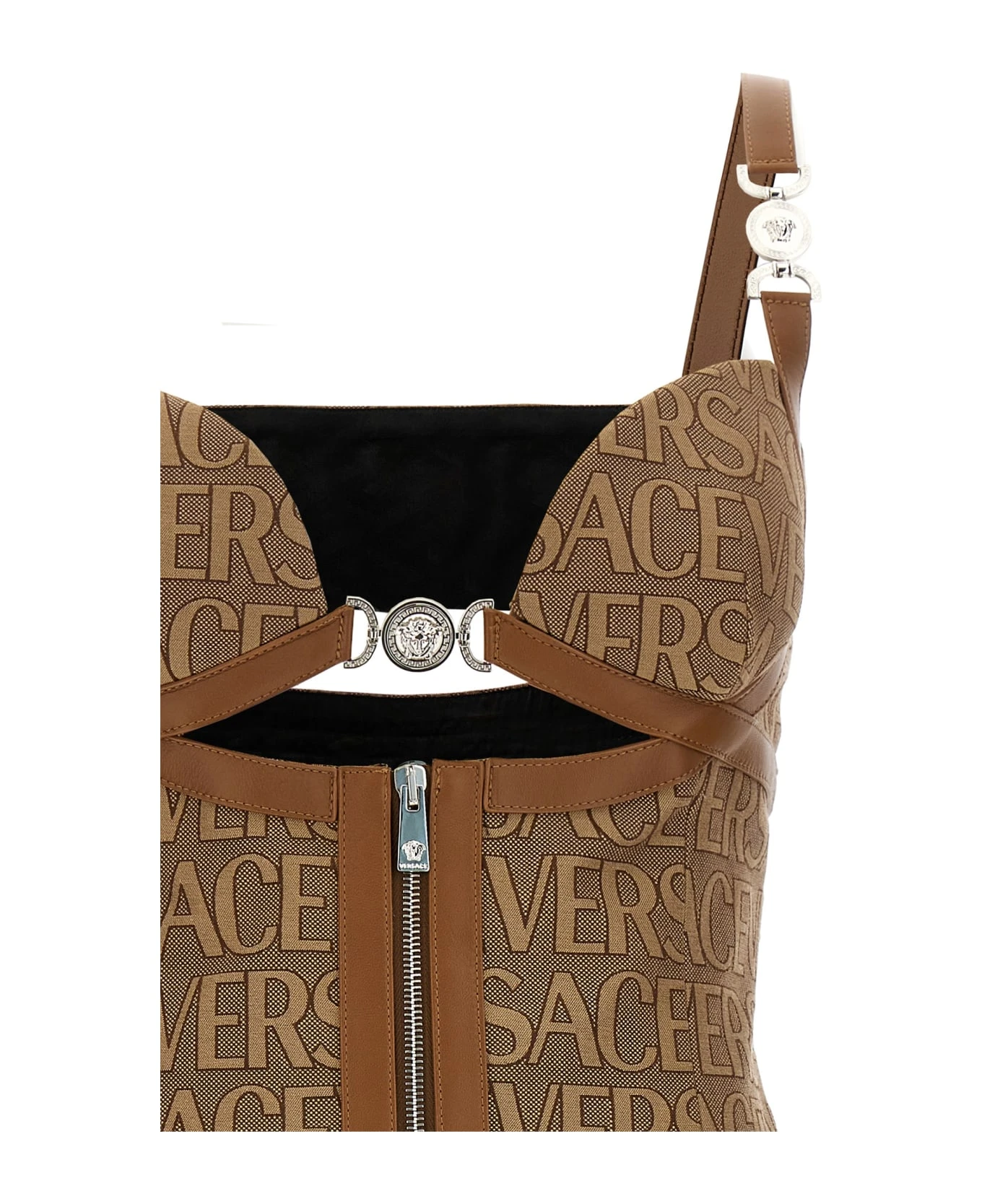 La Vacanza cotton blend capsule dress with jacquard ‘Versace Allover’ pattern, leather details, padded cups, front zip closure and Medusa ’95 metal details.