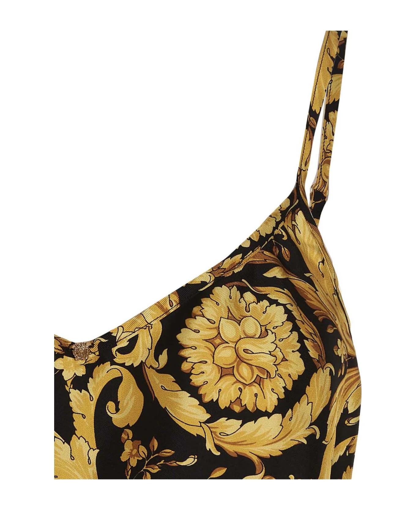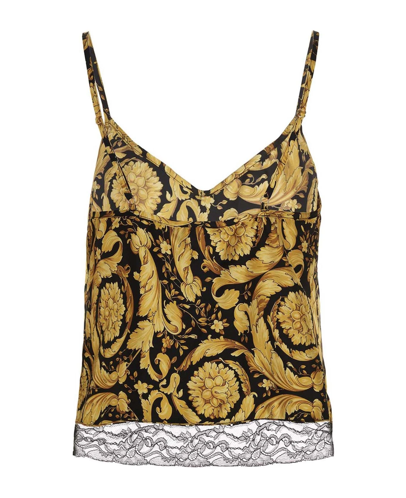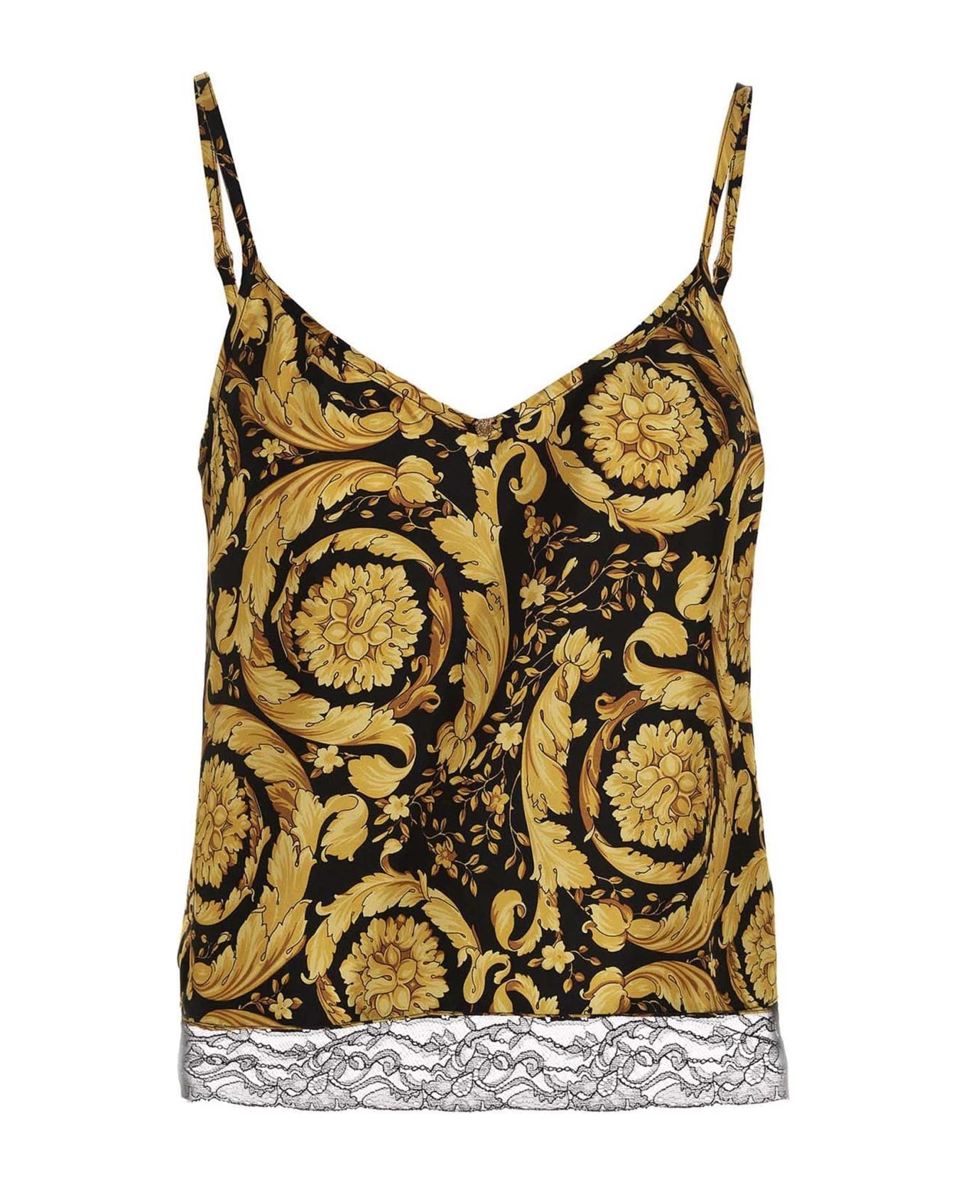 Silk tank top with all-over ‘Barocco’ print, lace insert on the hem, adjustable shoulder straps , Medusa charm on the front.