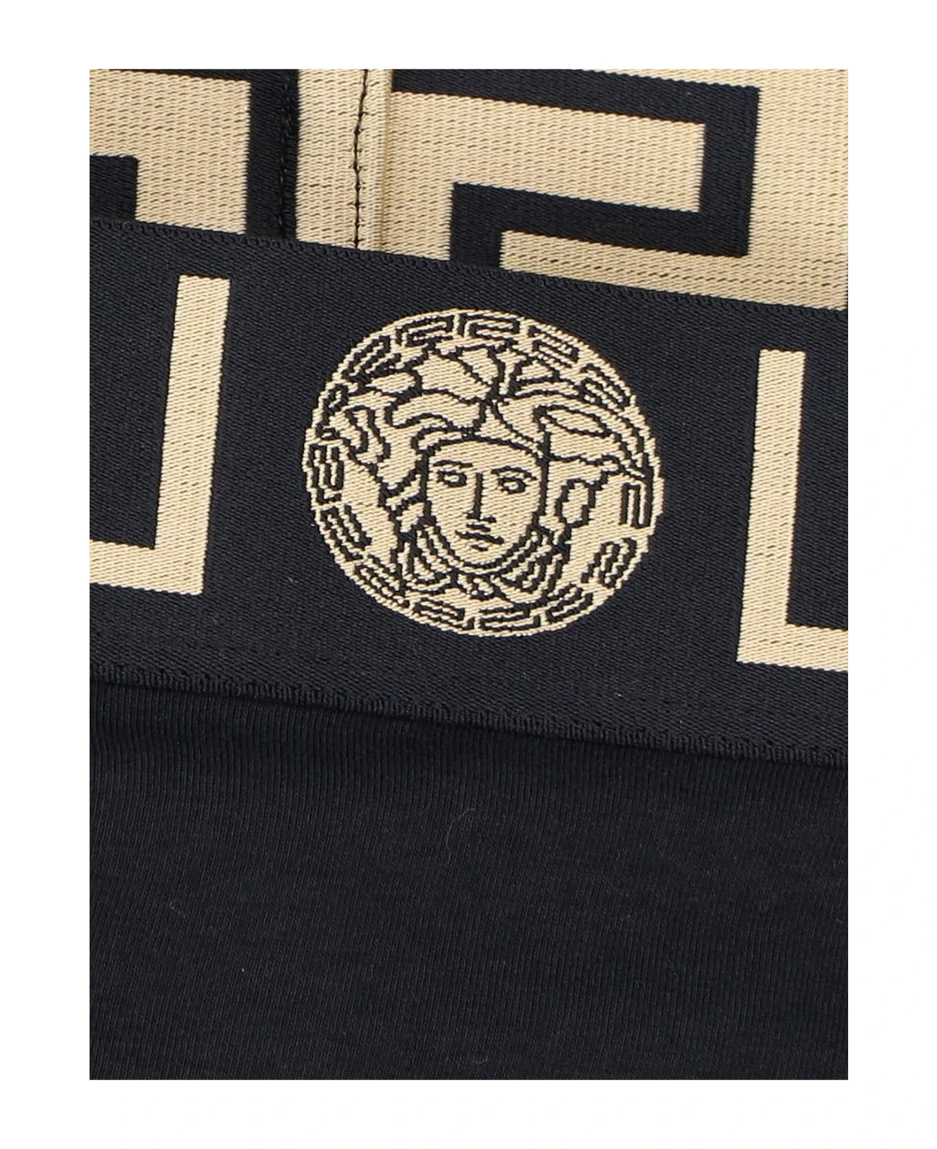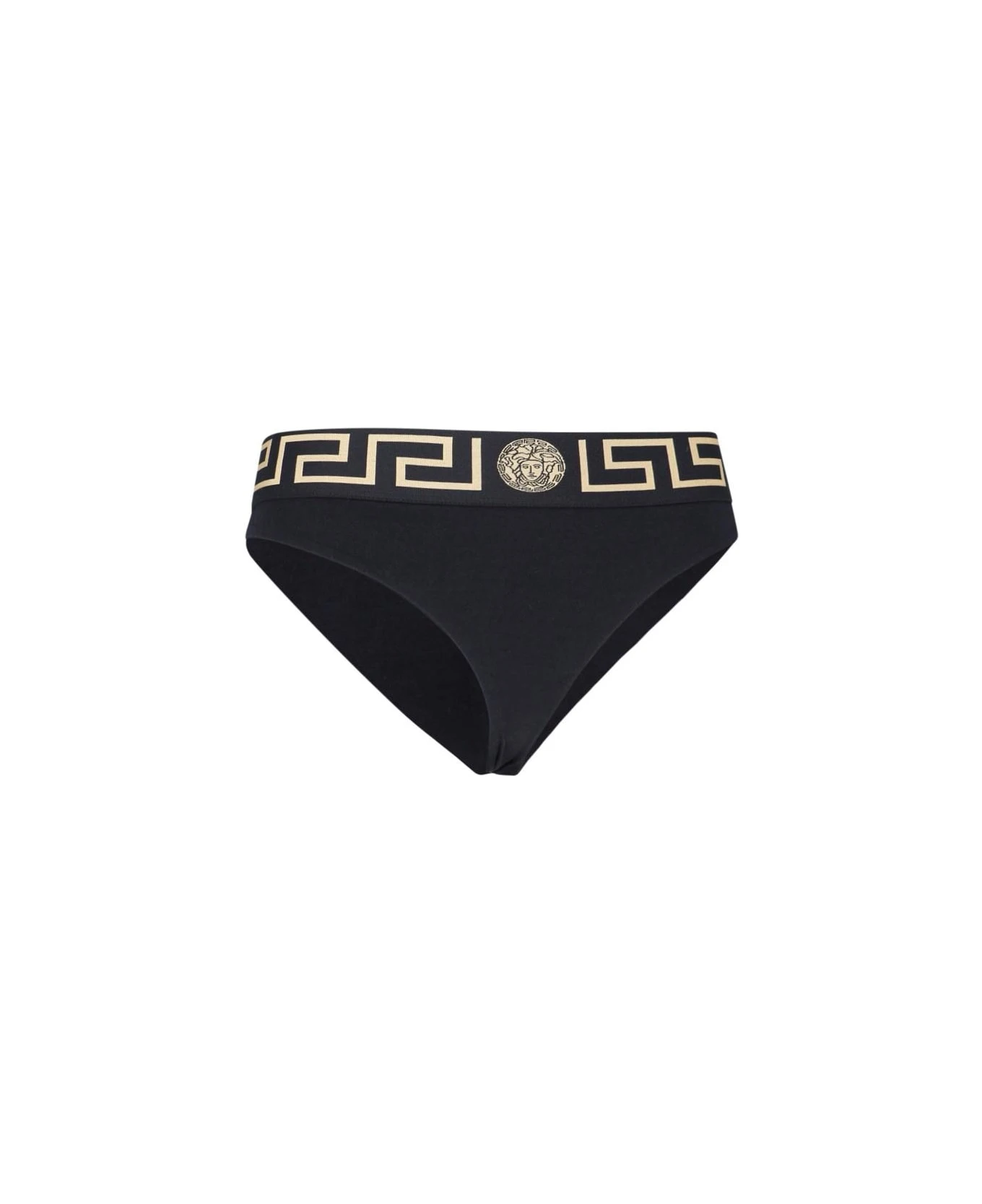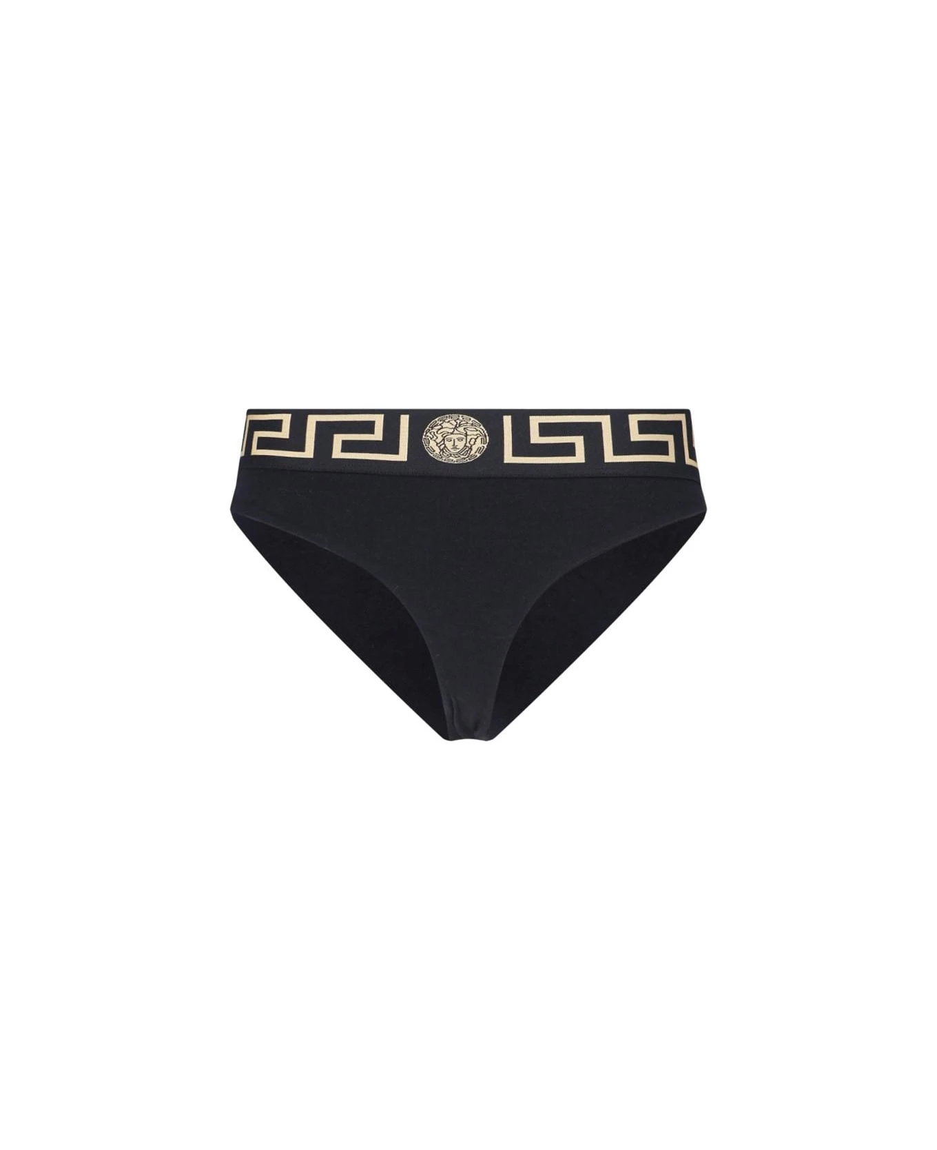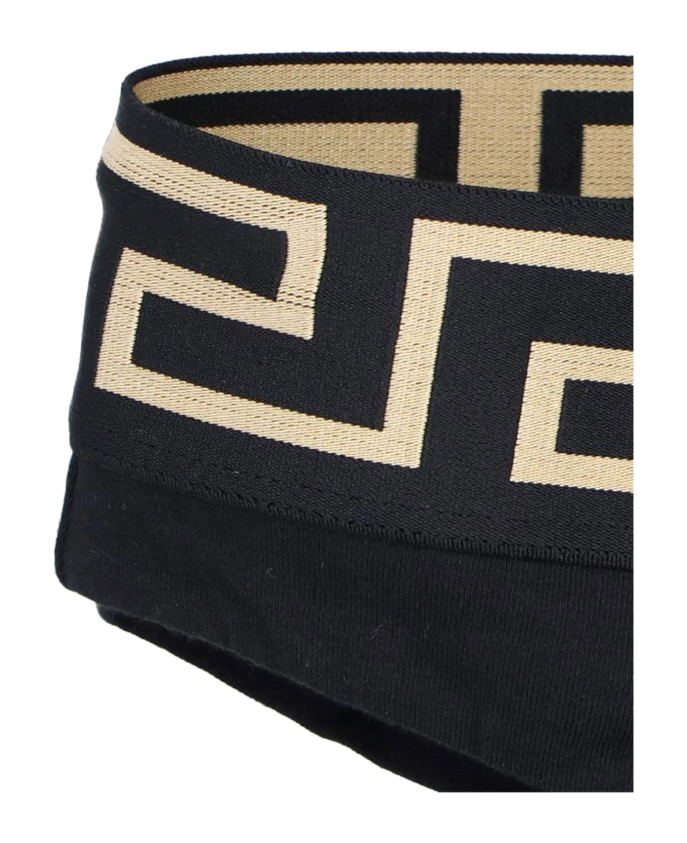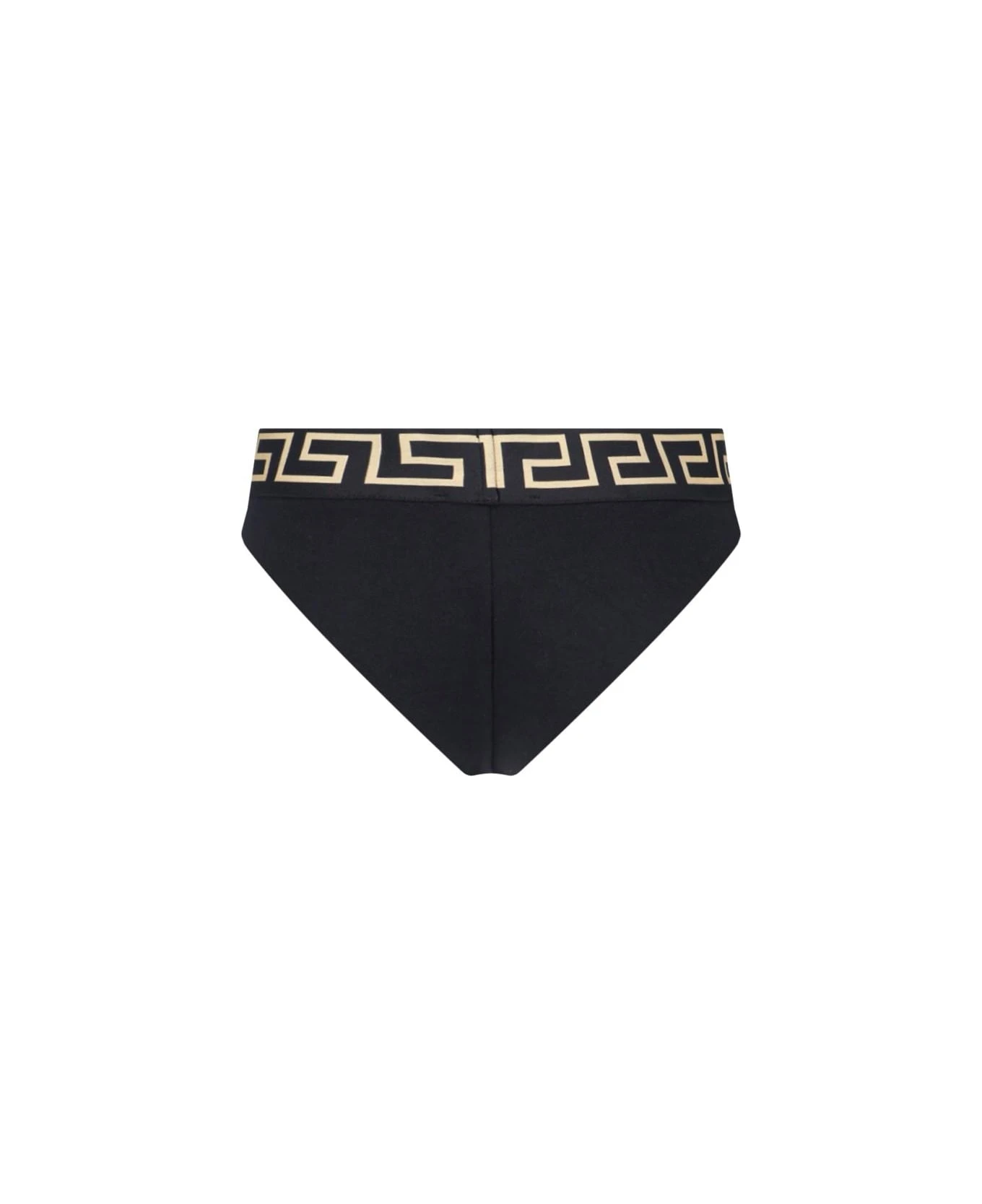 Versace ‘Bordo Greca’ briefs – made in organic cotton – black, with golden Greca motif elastic waistband, and a high top design.
