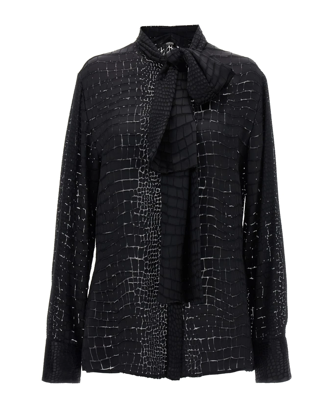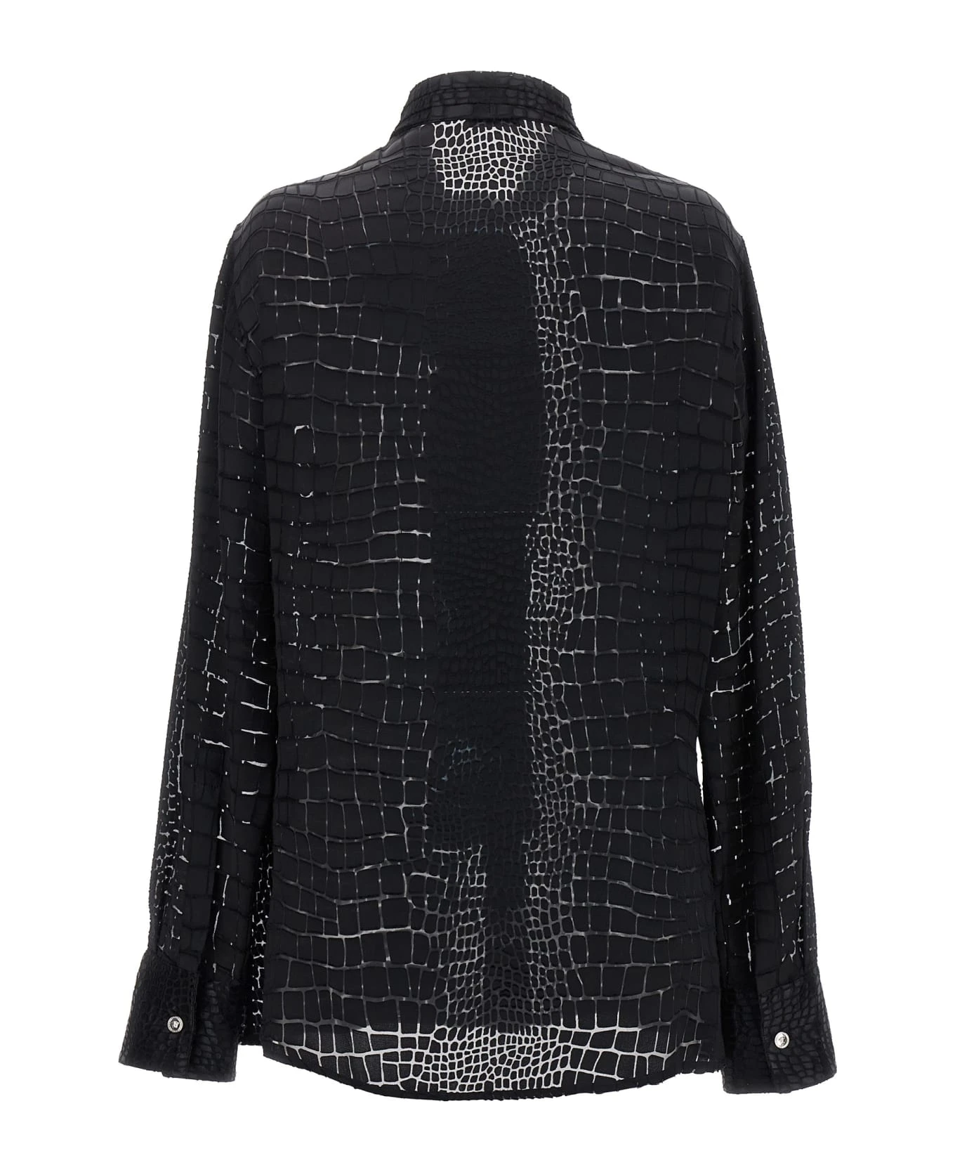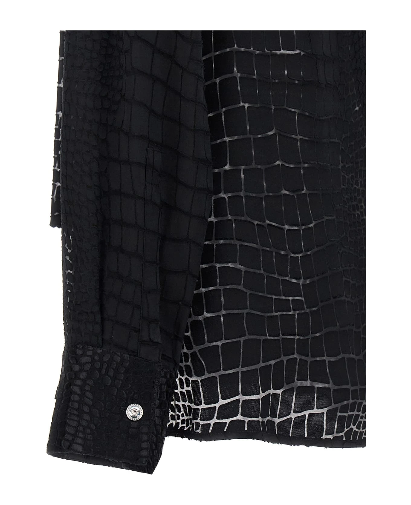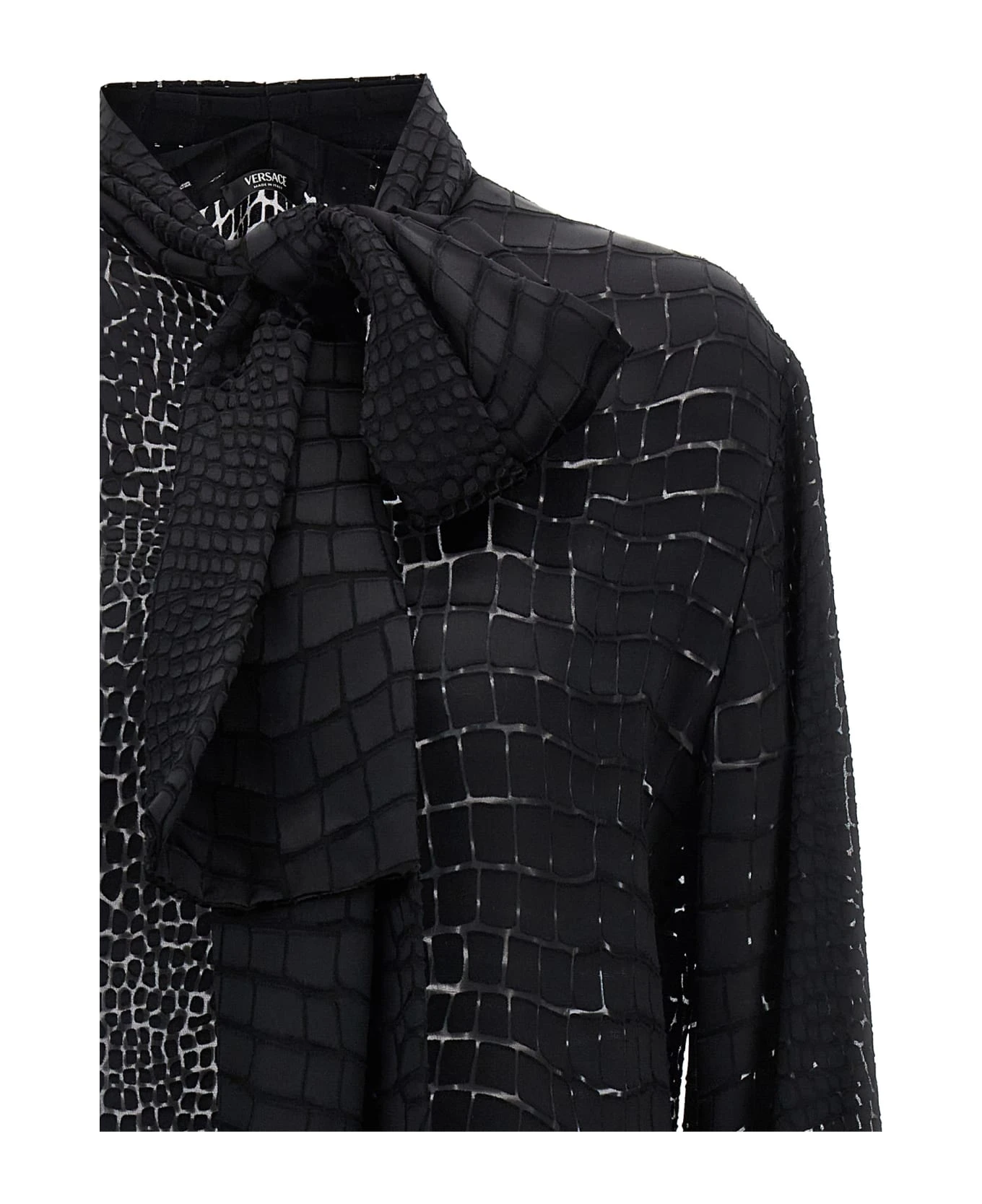 Crafted from d r iscose-silk satin with a crocodile effect, this Versace shirt features a tie neck, a hidden button placket, and classic barrel cuffs with Medusa button. The model is 177 cm tall and wears a size IT 40.