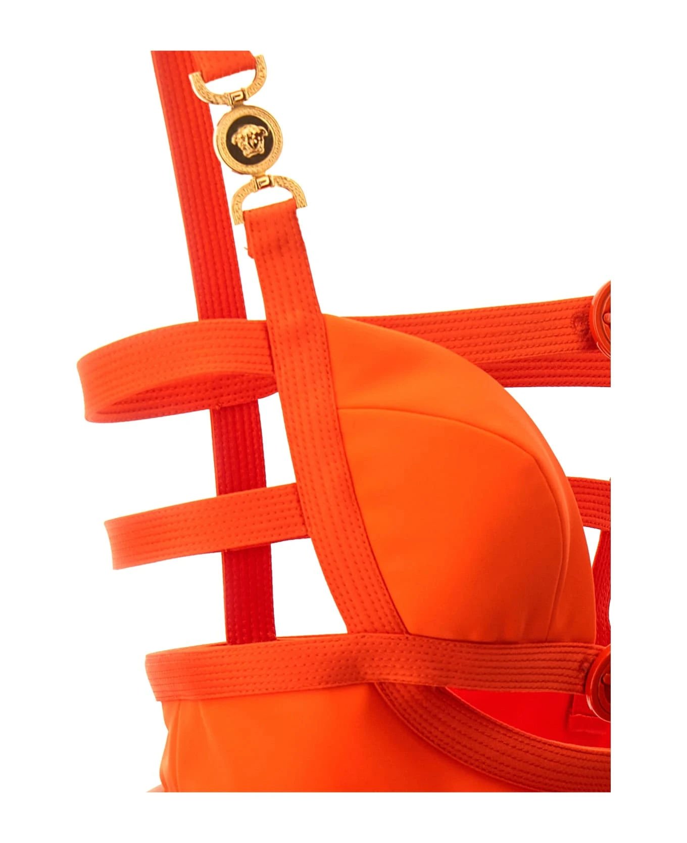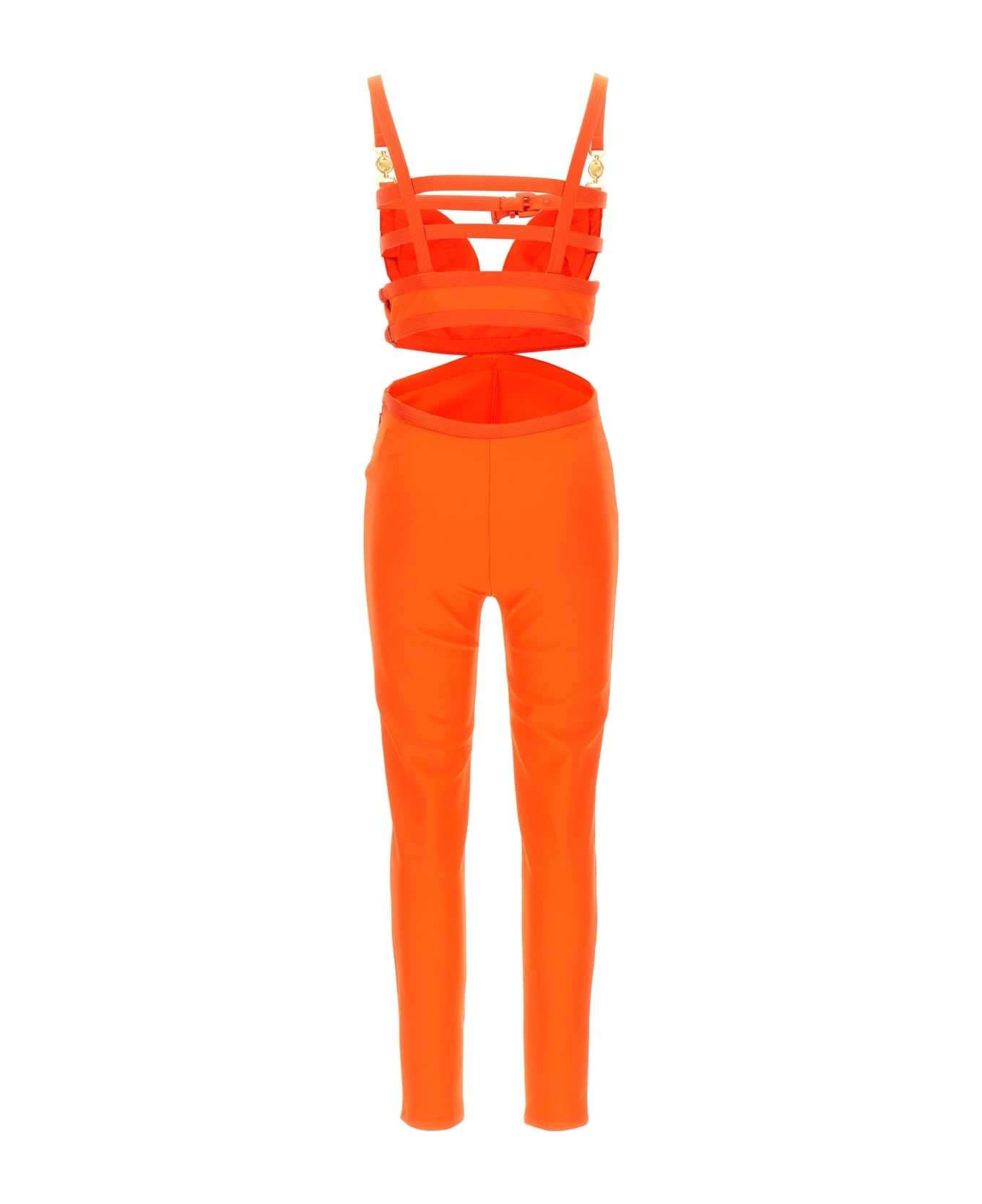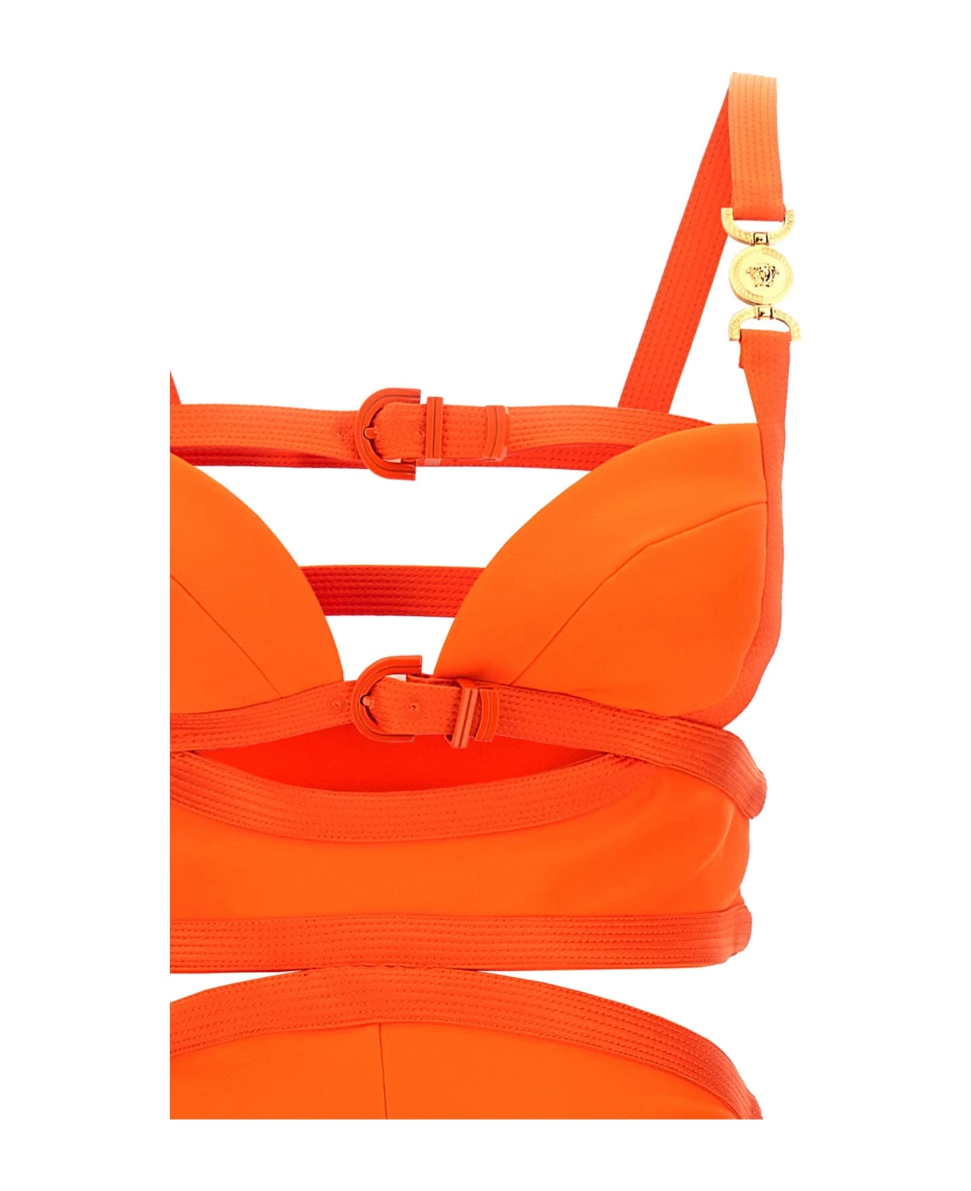La Vacanza capsule one-piece jumpsuit with ‘Medusa ’95’ details and buckles, and side zip closure.