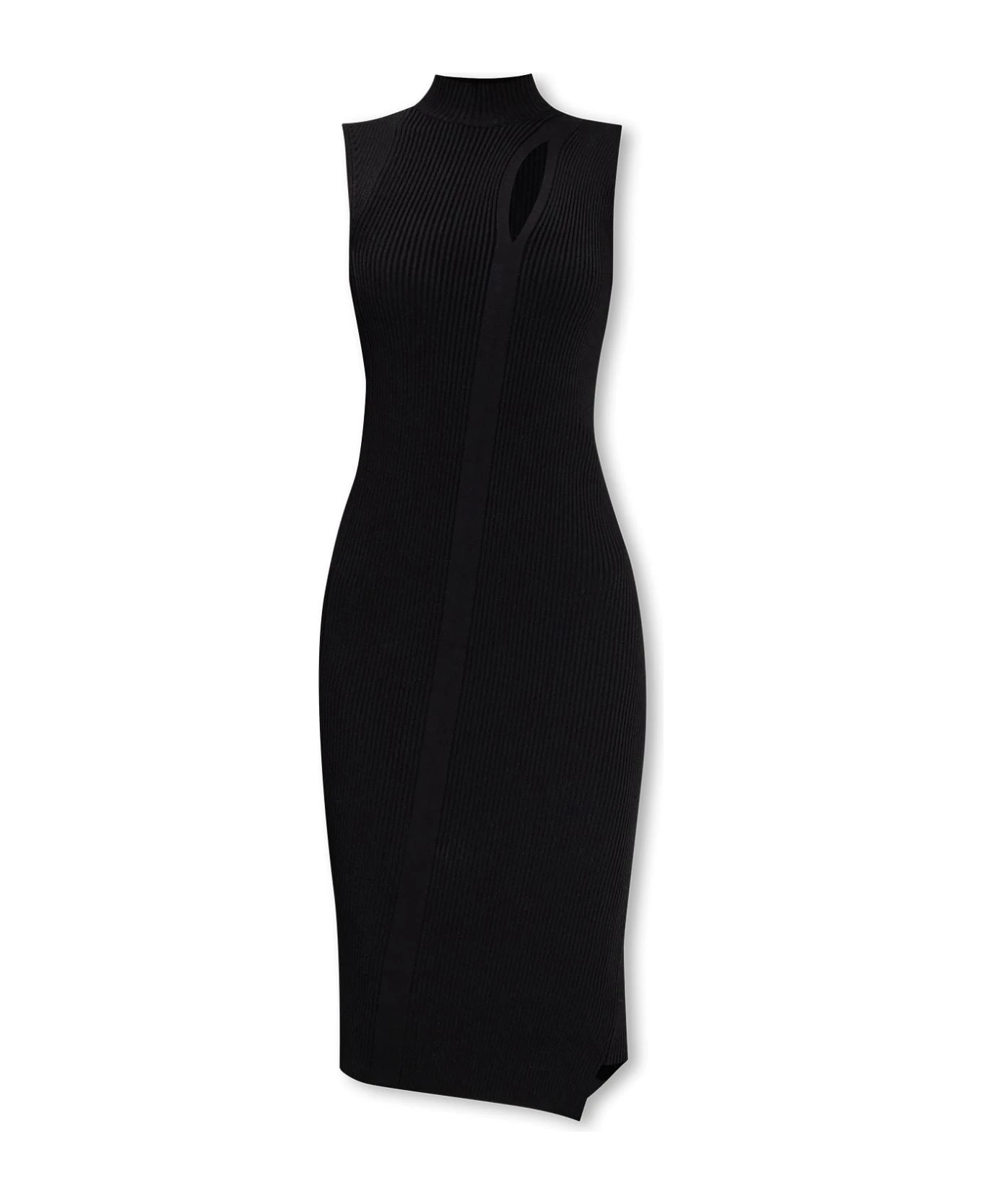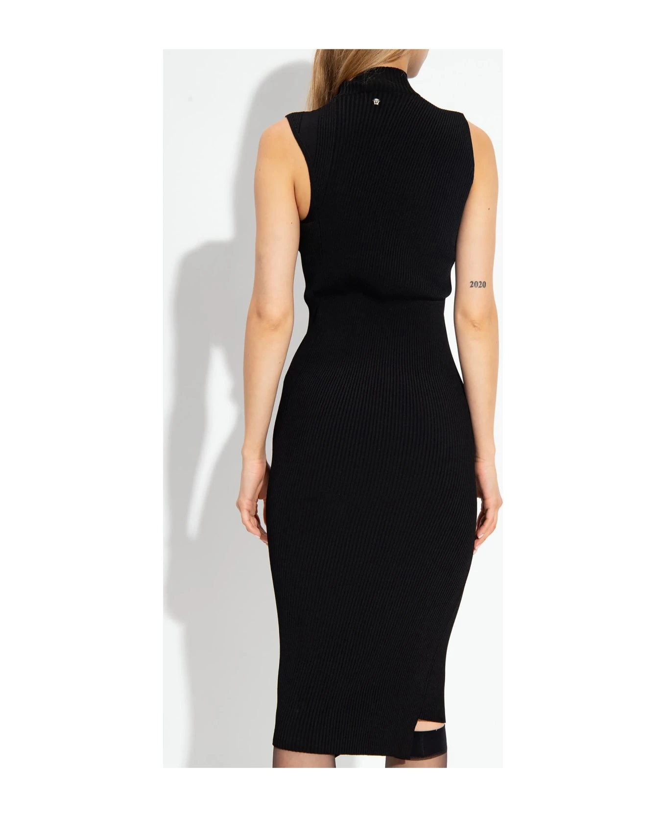 Black ribbed dress from Versace, ‘La Vacanza’ collection. This form-fitting design features a decorative cut-out on the front, Medusa head detail at the back, stand collar and asymmetric hem.
