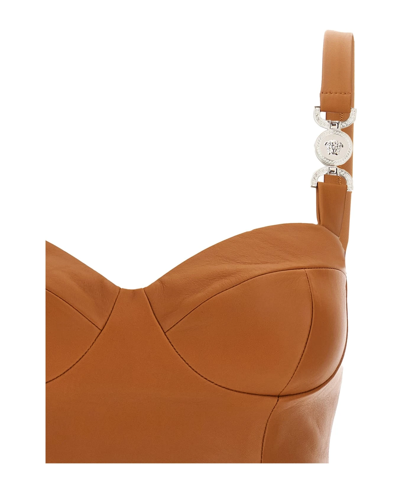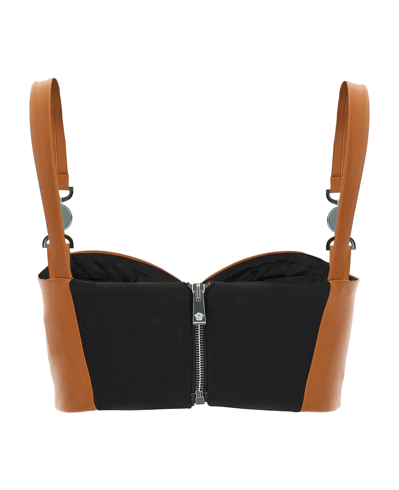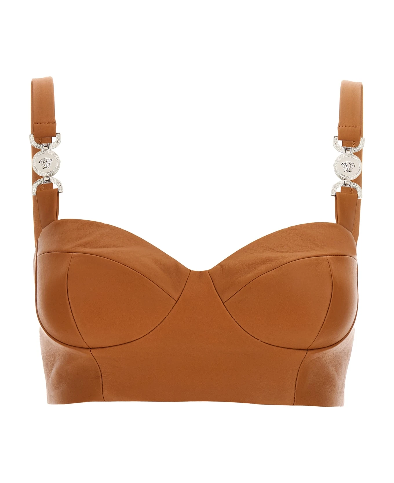 ‘Medusa ’95’ leather top with textured cups, shoulder straps with Medusa detail, back zip closure and elastic.