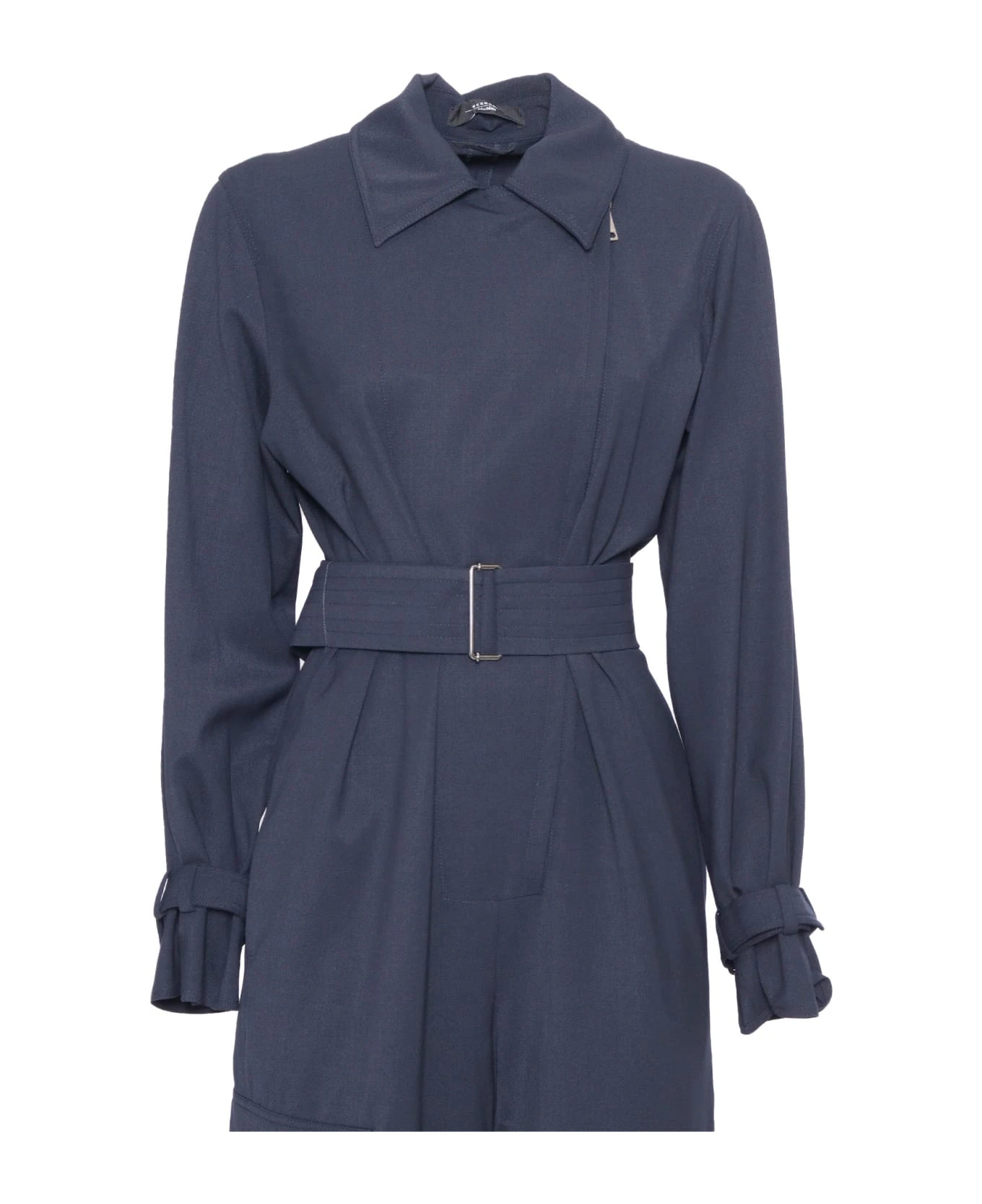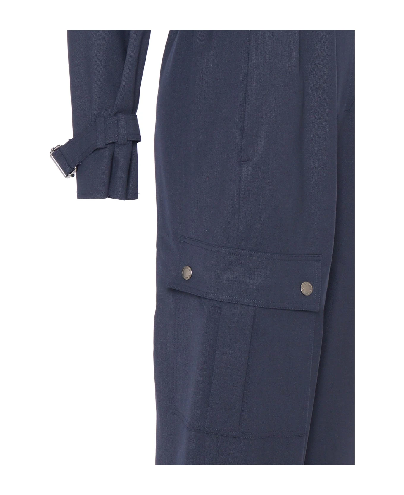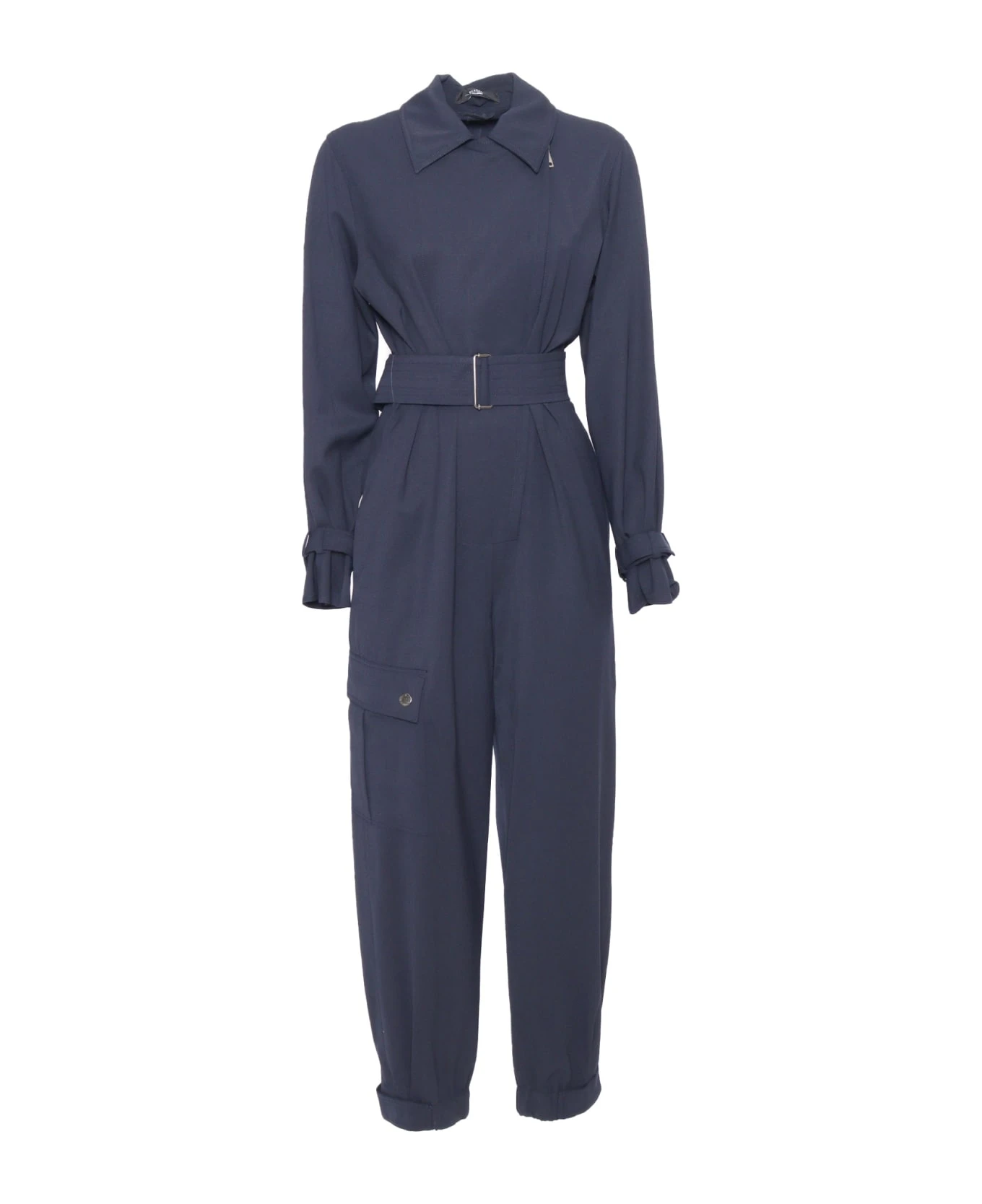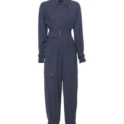 Wool gabardine jumpsuit, studded collar with lapel and zip, long sleeves with straps, patch pocket on one side, elastic with toggle at the bottom of the leg, belt to tie at the waist